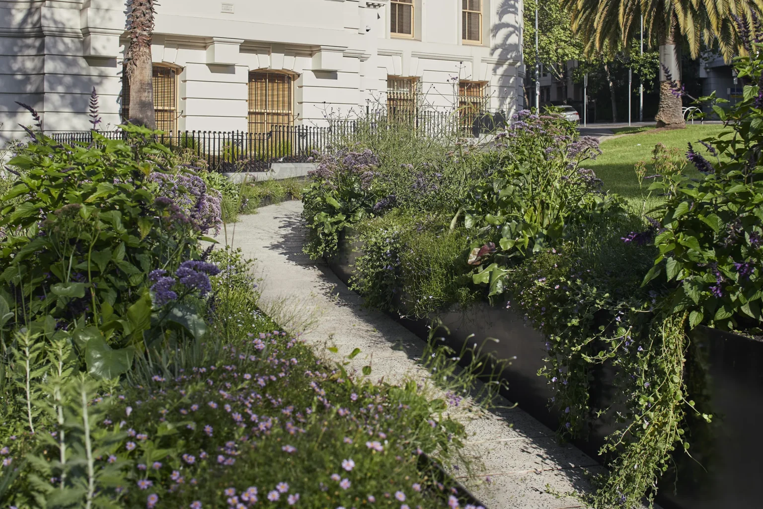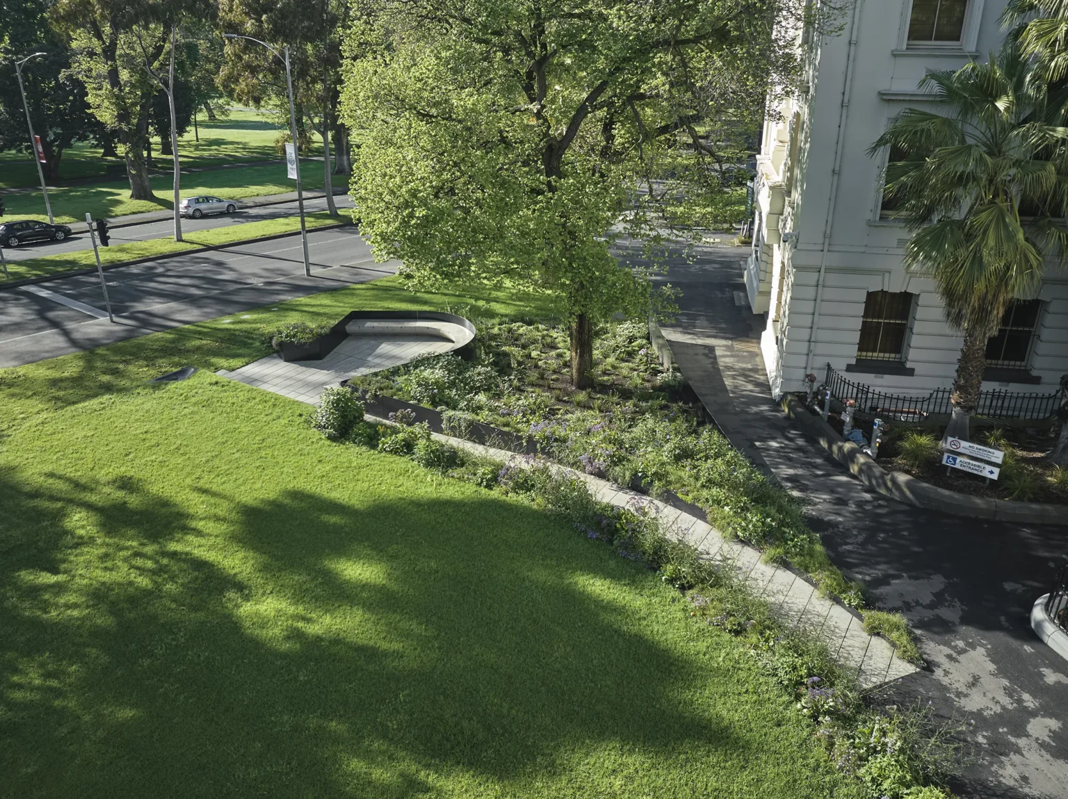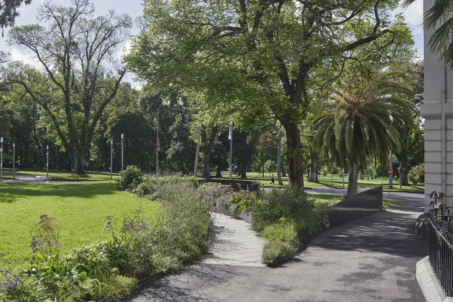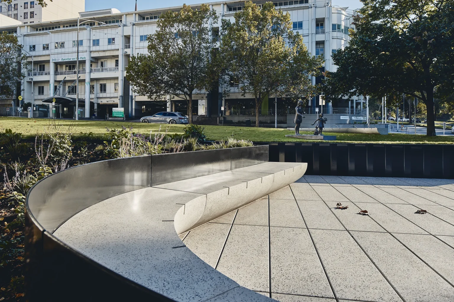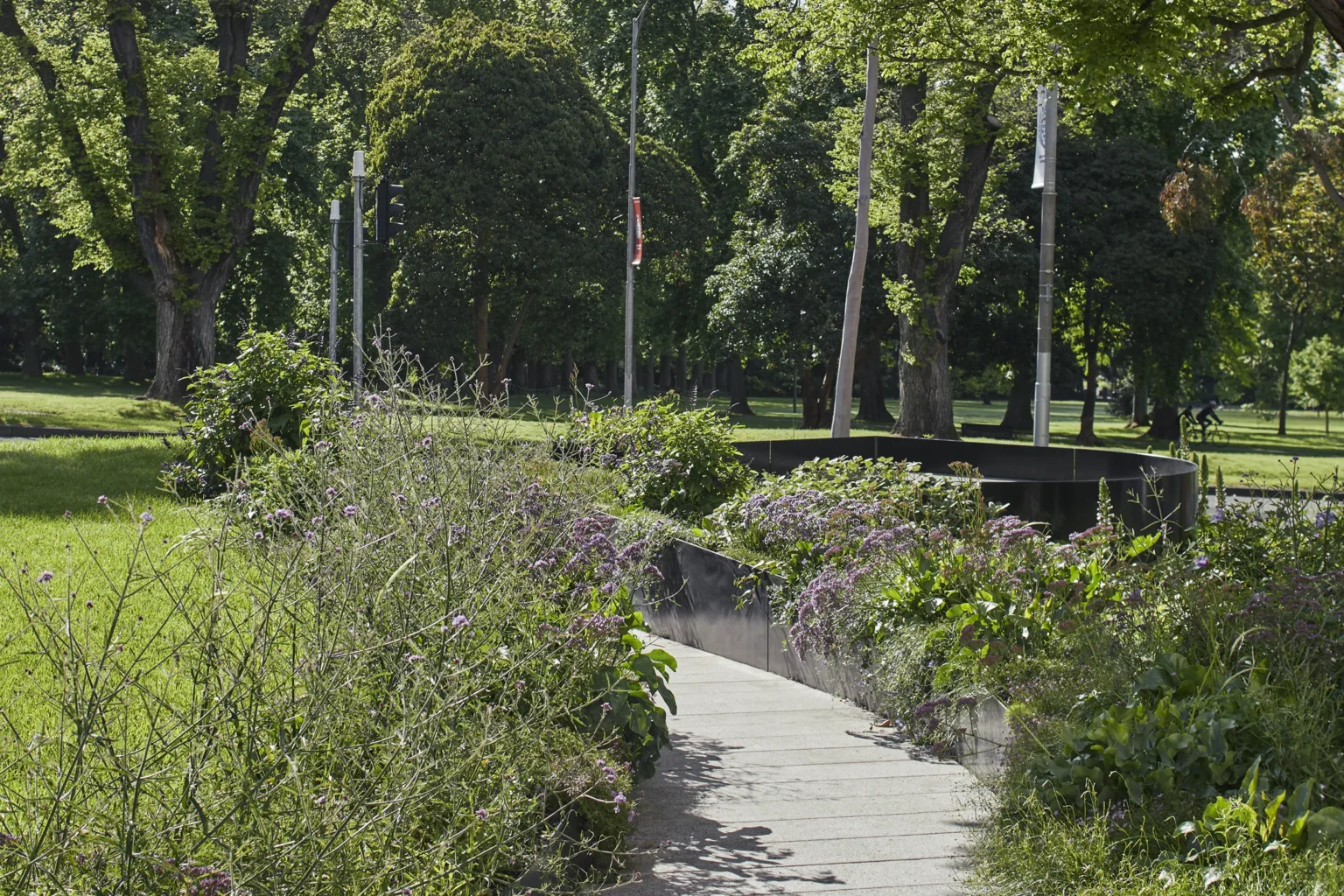 This is a place of strength. The Victorian Family Violence Memorial is located next to the Parliament Precinct in East Melbourne and has an outlook to Fitzroy Gardens. The design responds to the State Government’s brief for a permanent memorial for victims and survivors of family violence – a space where members of the community could gather and could reflect. The design for the Memorial is framed around five elemental design moves (a fold, a room, a wall, a seat and a garden) that change the way people behave in the site rather than changing the site itself. A large fold in the landscape forms an elevated space for congregation and the view beyond to Fitzroy Gardens. A Memorial wall folds into the landscape supporting the land above. A room defined by a seating edge sits below an existing elm tree and orientates the body to the Memorial wall and to the Gardens. New precast concrete decking is suspended above the tree protection zone of the Elm, creating a room accessed through a moment of procession and compression bracketed by planting. There is both a subtlety and strength to this landscape. The Memorial creates a place of pause and intimacy, while allowing people to feel connected to the broader parklands beyond.