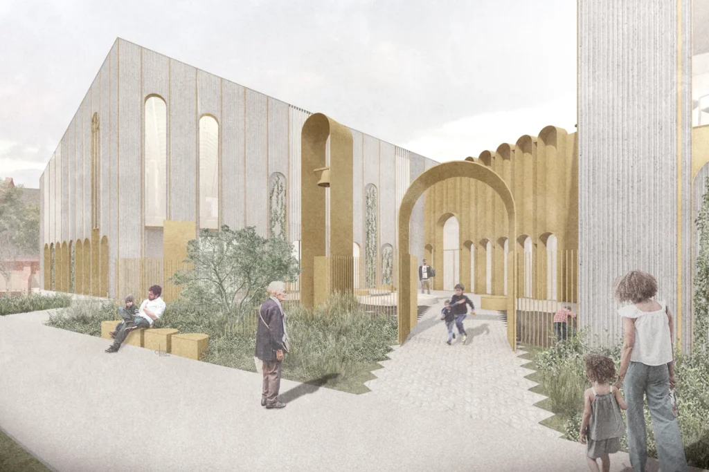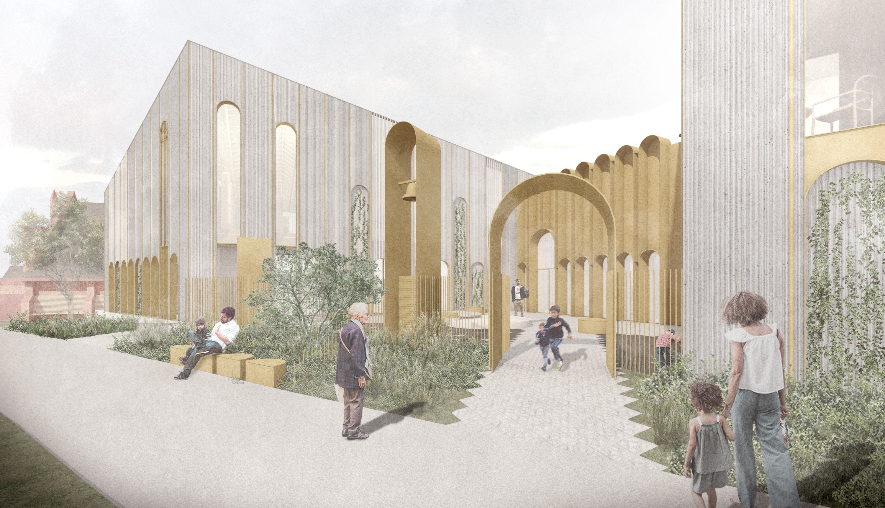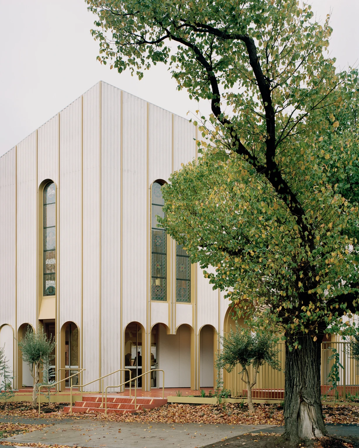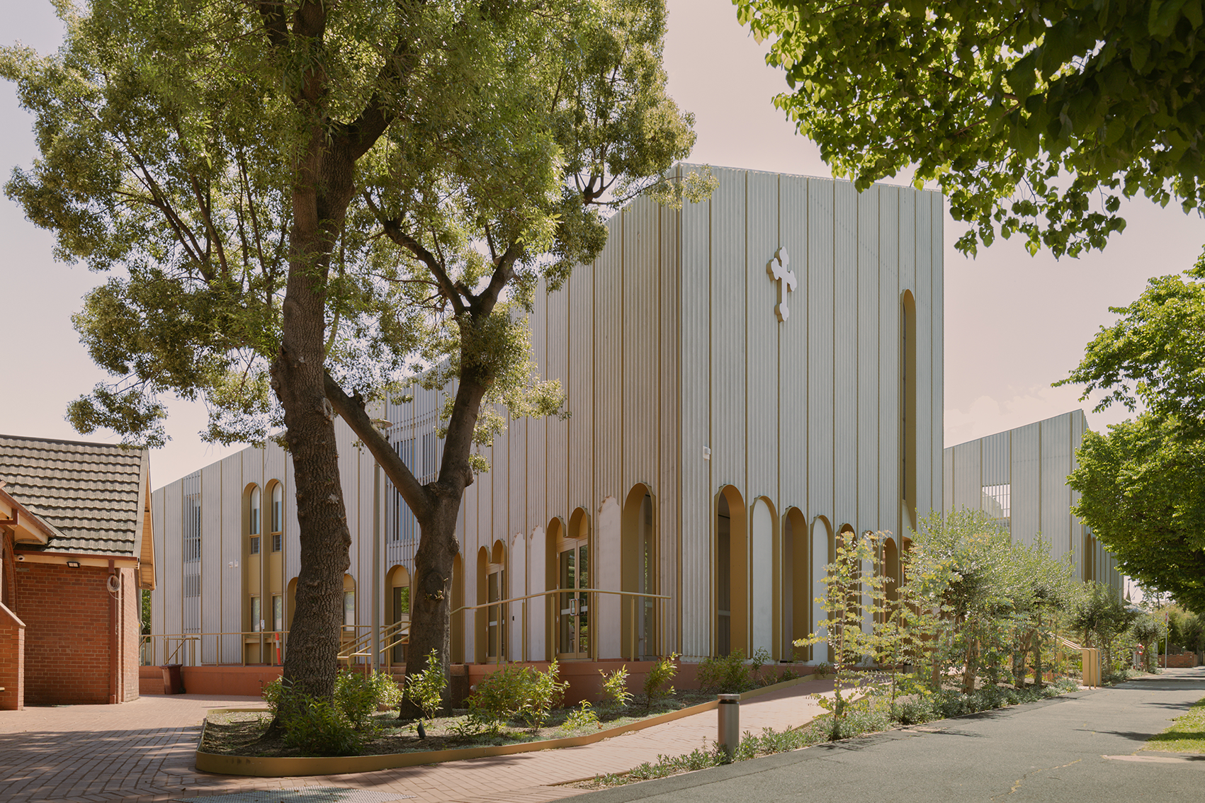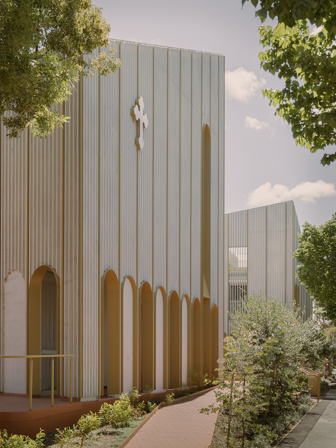 This is plants of the Mediterranean mingling with plants of Melbourne. Set next to an existing heritage church and within the residential context of Kensington, this project is a new and contemporary chapel, daycare facility and community building for the Coptic Orthodox Church. The new building is formed around a courtyard space facing the main street frontage. It is a generous public space paved with an ornate pin stripe of red clay and gold. This figured ground plane slips under the glazing line to connect the internal uses of the new building to the plaza and street beyond. A threshold is provided between the plaza and the street consisting of a band of planting, half located on terra-firma and half on structure – half planted from the indigenous Eucalyptus pulverulenta compacta in coppiced form and half planted from mature specimens of the exotic Olea europaea. These are plants with different origins, but that share a common colour tone. They mingle on site as a reminder of the ancient foundations of the Coptic Church and the ancient Country that it has been transported to. The trunks are set at equal spacings, mirroring the rhythm of the colonnade behind them. This band marks the boundary between public and private as a green and porous edge rather than a wall – an exchange with the public street rather than a retreat from it.