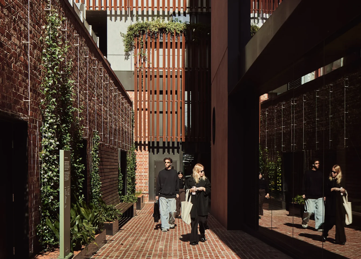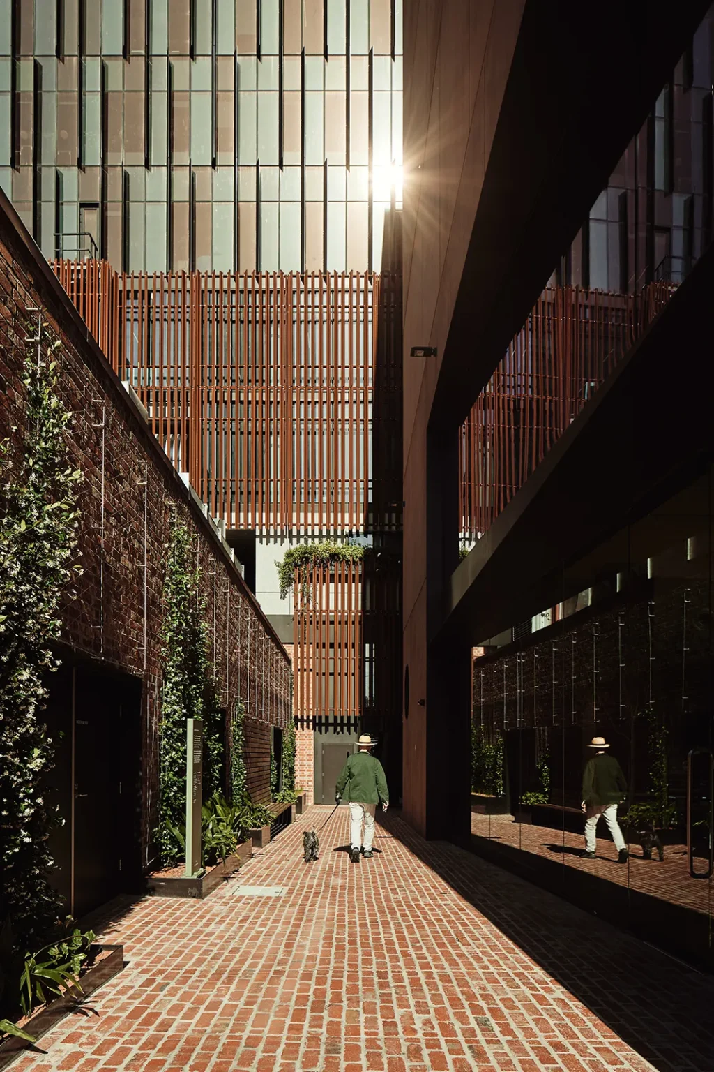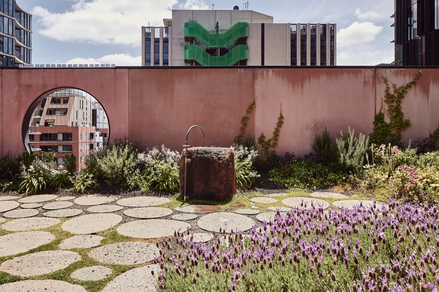 This is a walled garden in the sky. The Northumberland Street project is located in and around the industrial fringe of Collingwood. The brief called for a large quantum of new commercial and office space above an existing telecommunications exchange building. The public realm is designed to negotiate the super-scale of the office building and the fine grain of the retained heritage exchange buildings through a series of intimate lanes and a smaller ‘companion’ building that holds the street corner. The lanes recycle bricks from existing buildings, creating a materially rich and detailed pedestrian experience, punctuated by parasitic frames with climbing and cascading plants. The roof top of the companion building has been designed as a walled garden or hortus conclusus for the amenity of workers from the adjacent building which access it via an open-air bridge. This garden is ‘other’ to Collingwood. Asphalt gives way to stone steppers and rambling plants. The sound of traffic gives way to the sound of water. An array of herbs and medicinal plants are arranged as an inversion of, and refuge from, the city below.