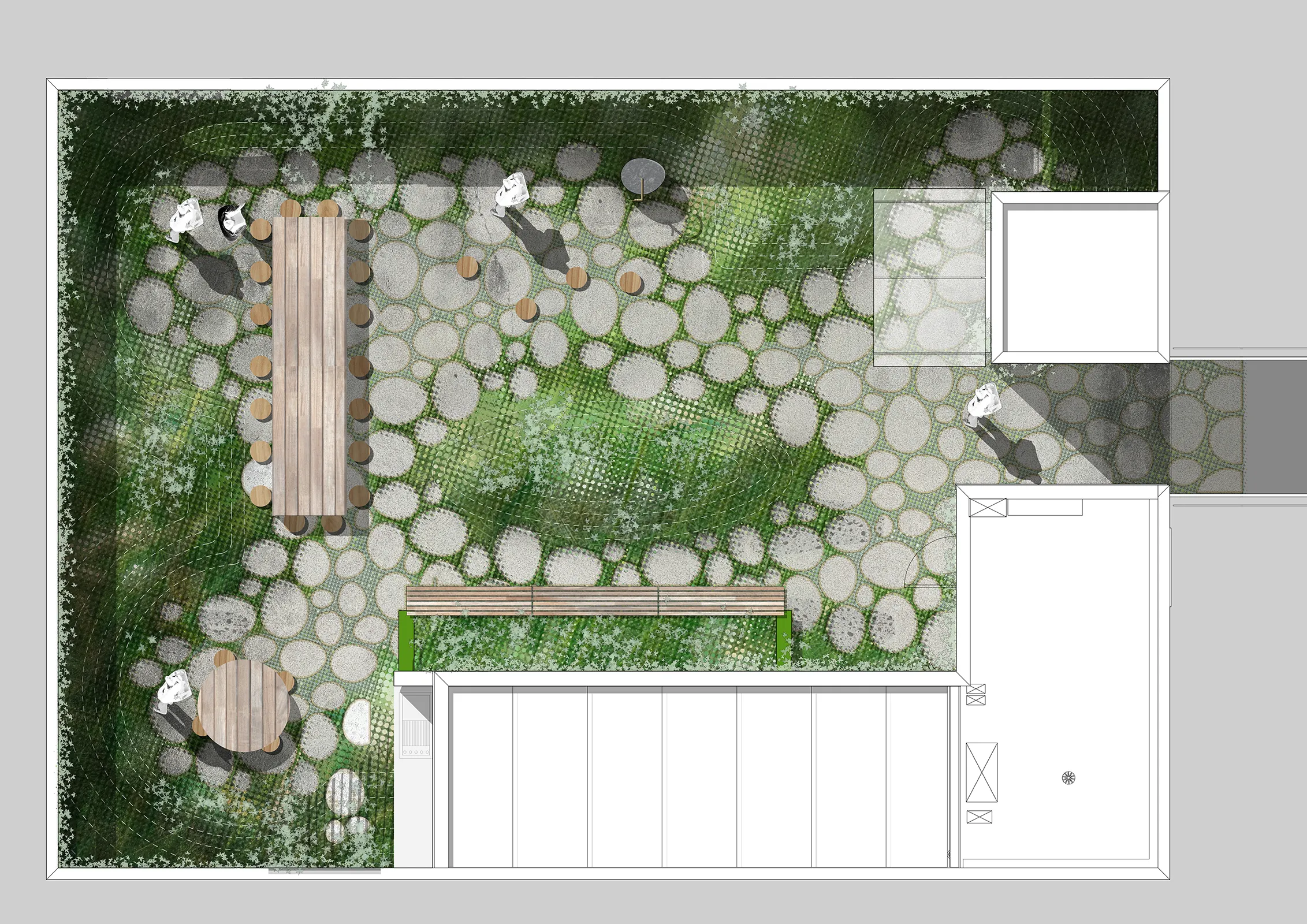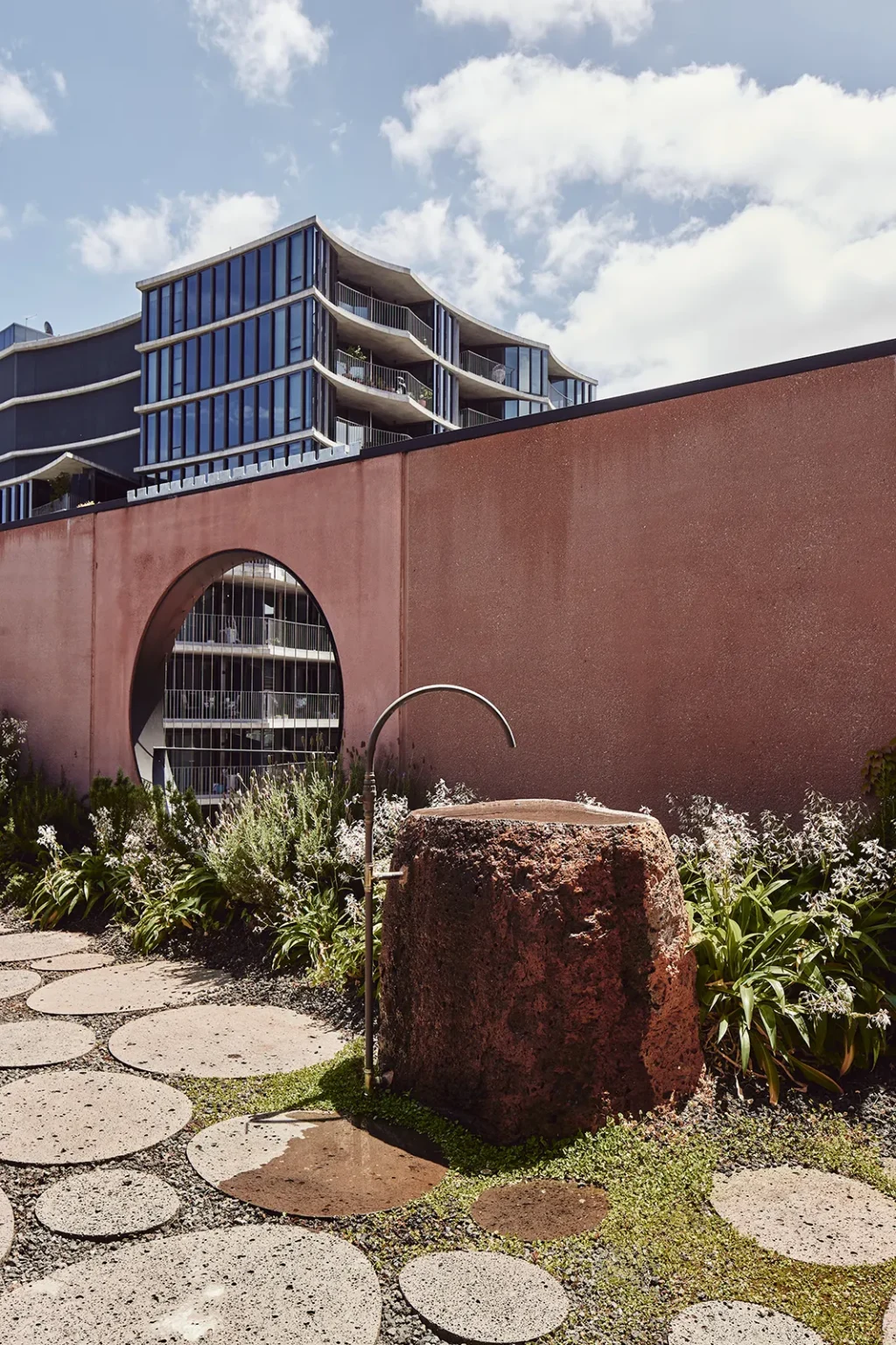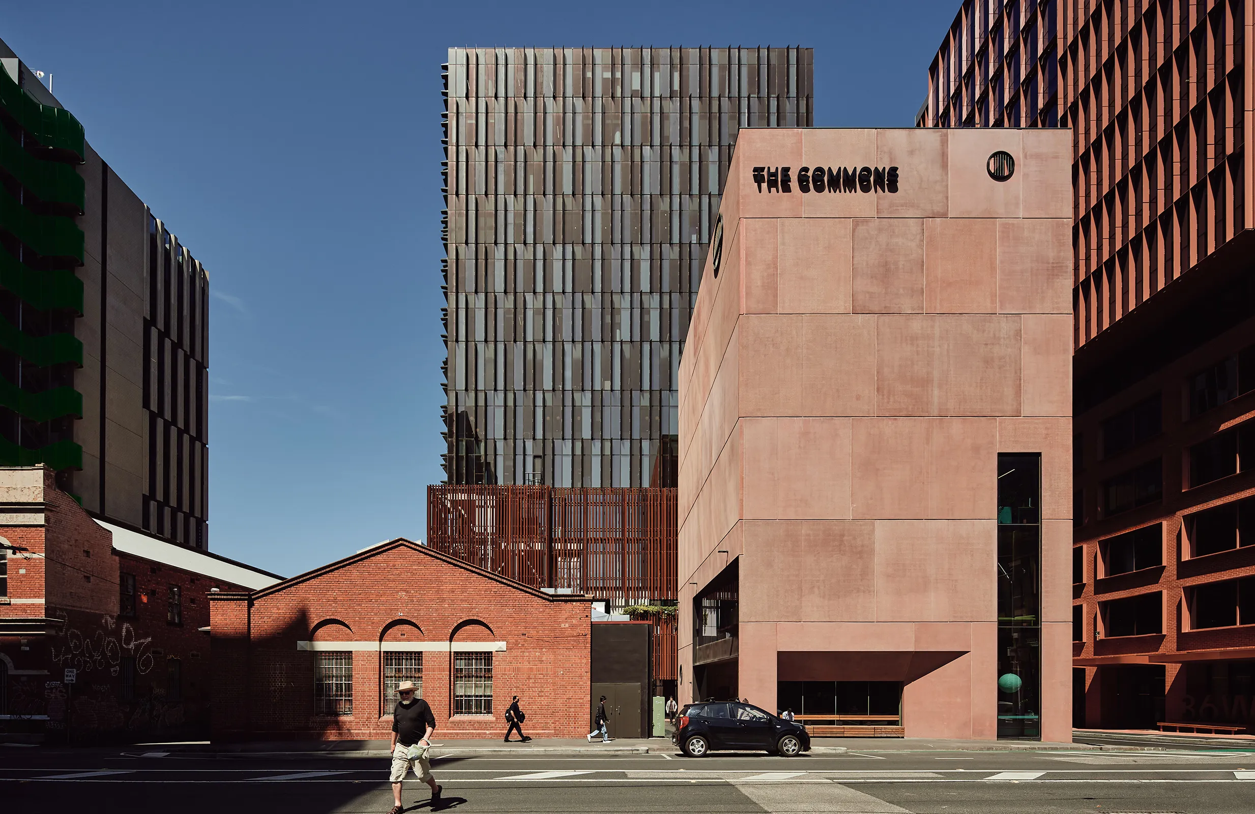 This is a walled garden in the sky. The Northumberland Street project is located in and around the industrial fringe of Collingwood. The brief called for a large quantum of new commercial and office space above an existing telecommunications exchange building. The public realm is designed to negotiate the super-scale of the office building and the fine grain of the retained heritage exchange buildings through a series of intimate lanes and a smaller ‘companion’ building that holds the street corner. The lanes recycle bricks from existing buildings, creating a materially rich and detailed pedestrian experience, punctuated by parasitic frames with climbing and cascading plants. The roof top of the companion building has been designed as a walled garden or hortus conclusus for the amenity of workers from the adjacent building which access it via an open-air bridge. This garden is ‘other’ to Collingwood. Asphalt gives way to stone steppers and rambling plants. The sound of traffic gives way to the sound of water. An array of herbs and medicinal plants are arranged as an inversion of, and refuge from, the city below.
