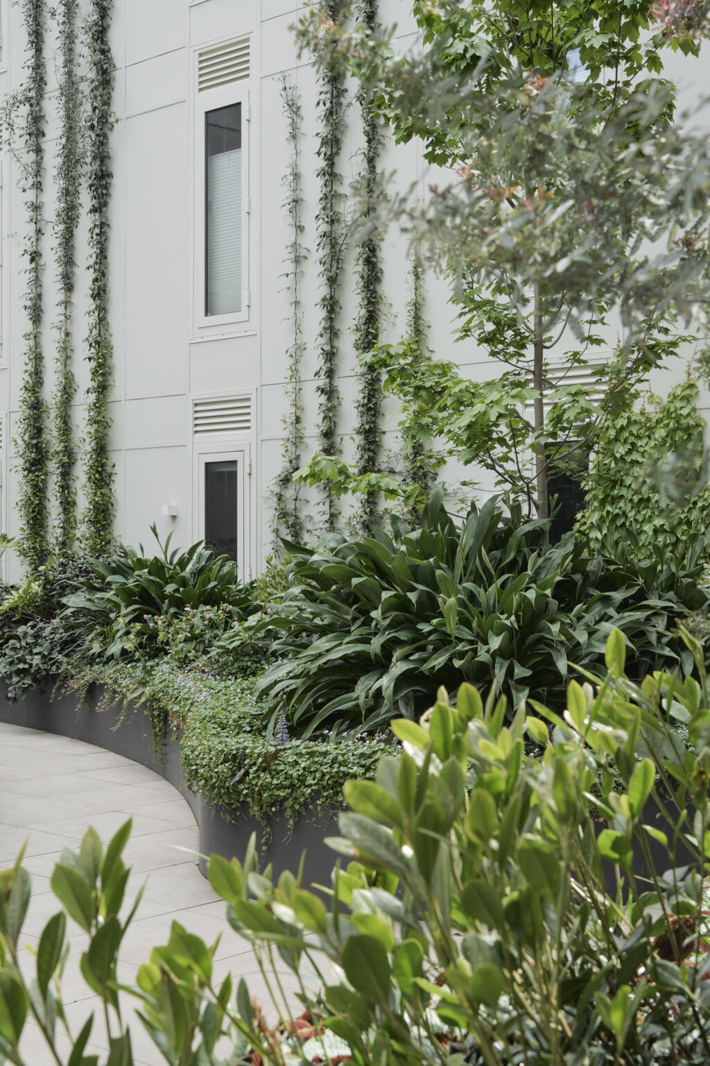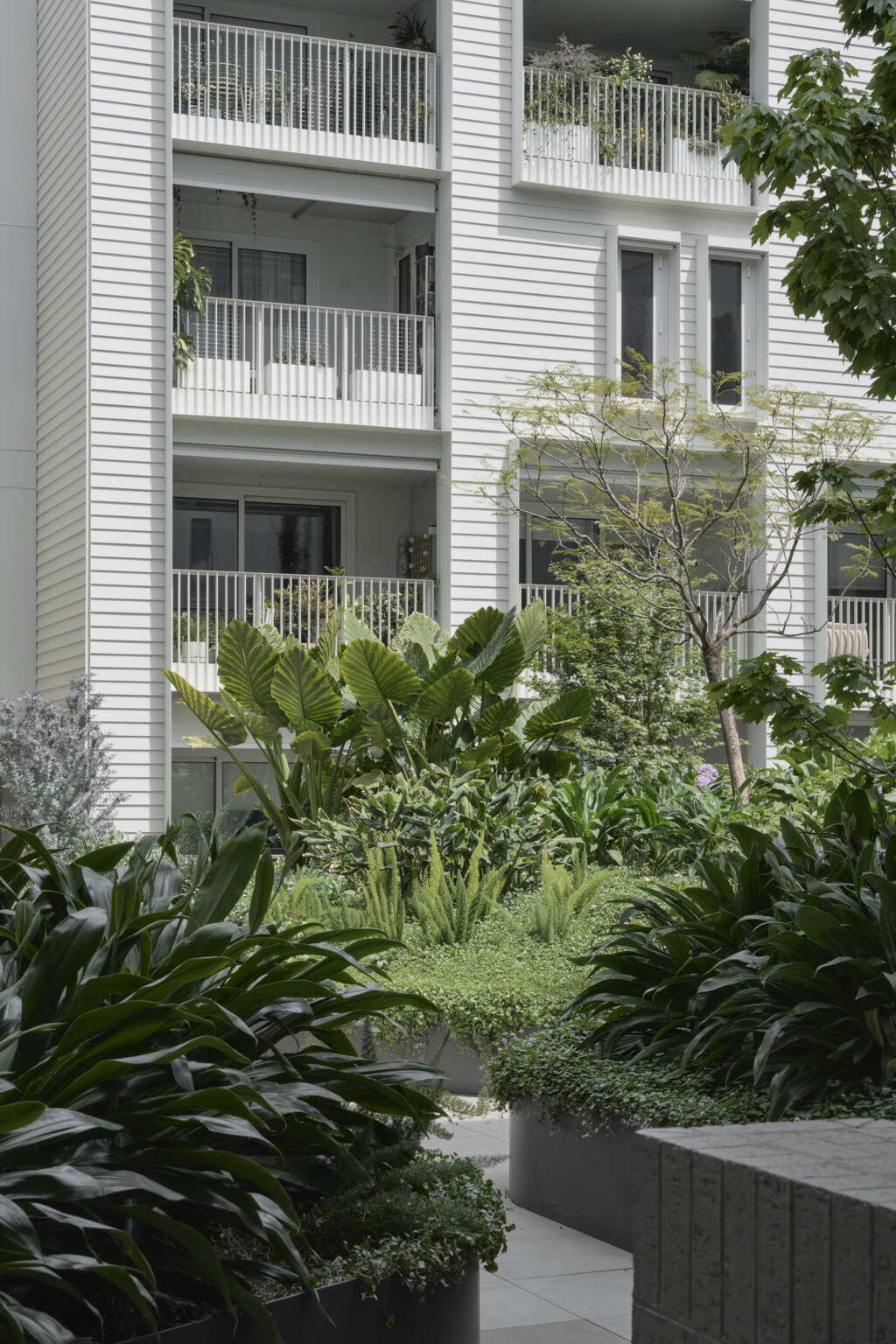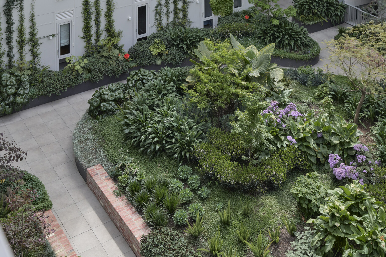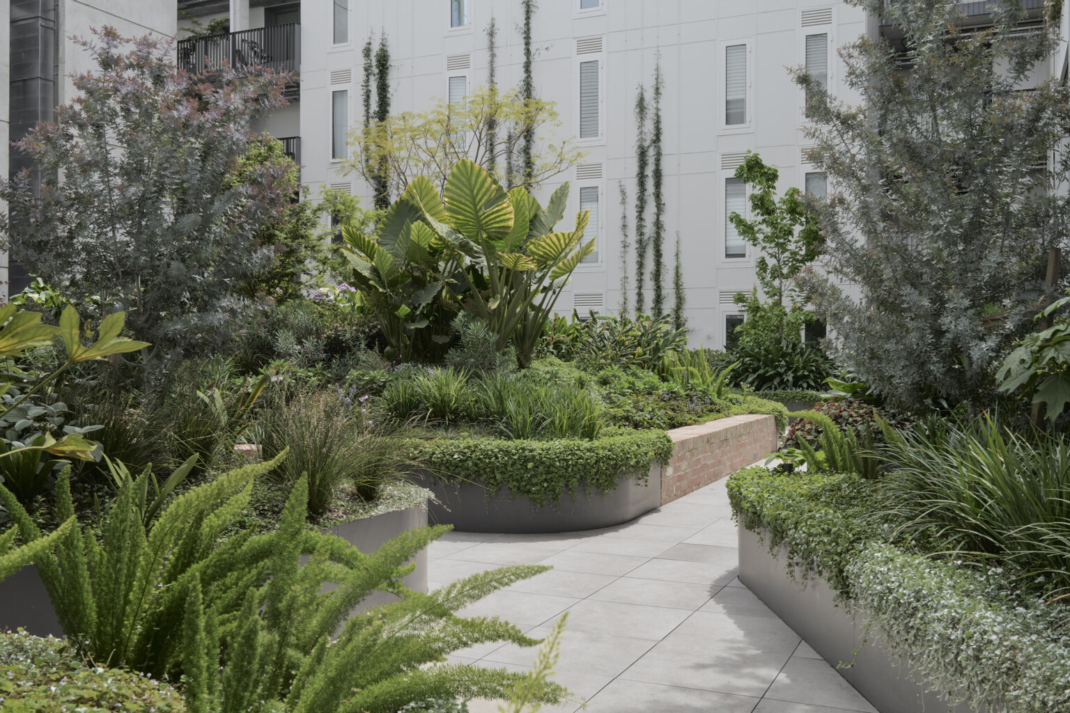 This is a building arranged around a green centre. Little Miller Street is a multiple residential project adjacent to Balfe Park in Brunswick. The brief called for a massing response on a square site that created its own internal amenity. The scheme re-imagines medium density living as something wrapped around and a connected to a central courtyard space suspended above a level of carparking below. This space functions as shared address to homes that front it on level 1 and that acts as a constantly changing visual amenity for the apartments above which look upon it. Openwork’s landscape design establishes a generous, green courtyard that binds four architecturally distinct buildings into a single neighbourhood. A new blue stone laneway along Balfe Park extends the civic realm, improving permeability and public amenity while embedding the project within Brunswick’s fine-grain fabric. Productive planting, permeable surfaces, and shaded microclimates foster ecological resilience and community life. From ground-level town houses to rooftop terraces, the landscape supports daily routines with landscape at their centre — a living infrastructure for a low-carbon, car-light future.