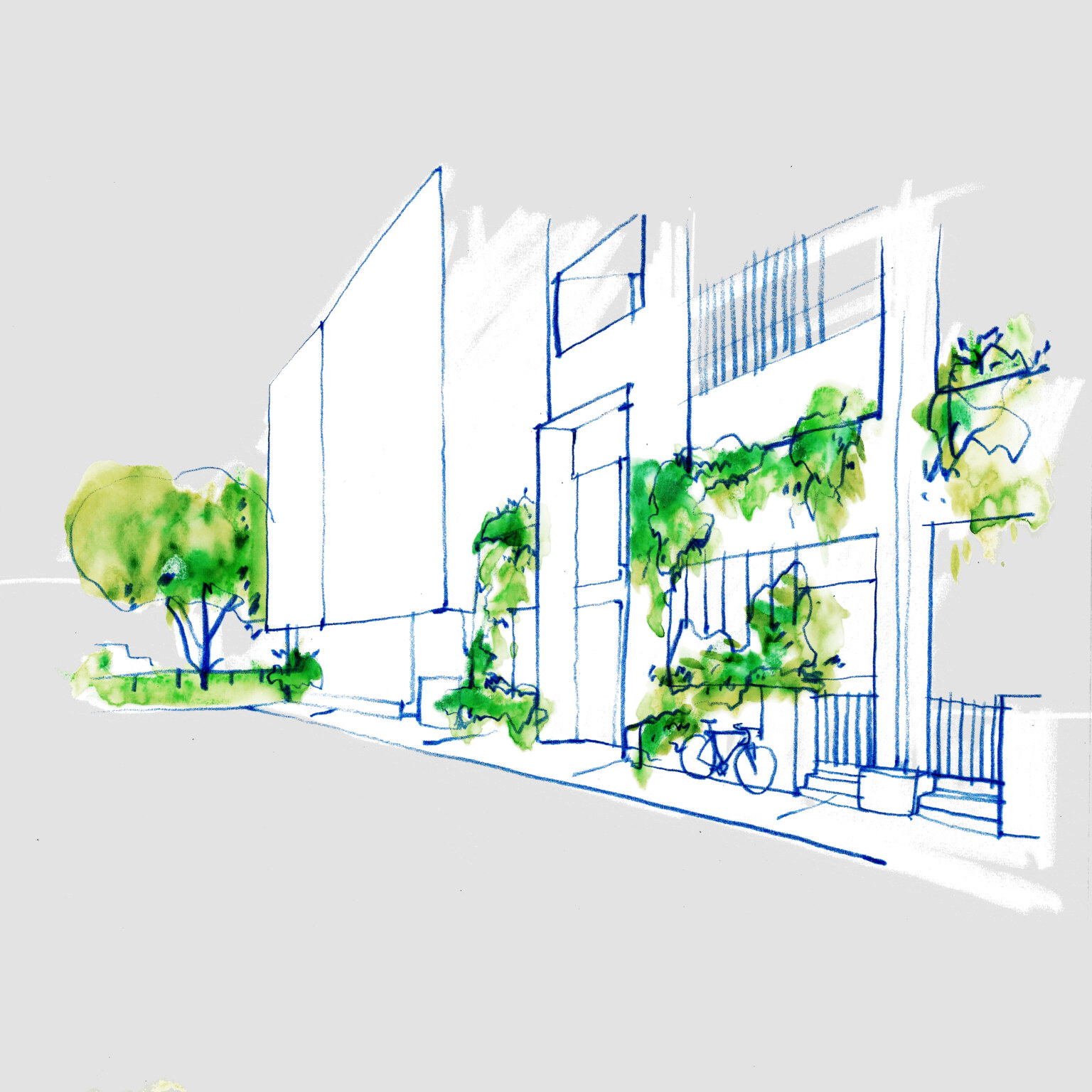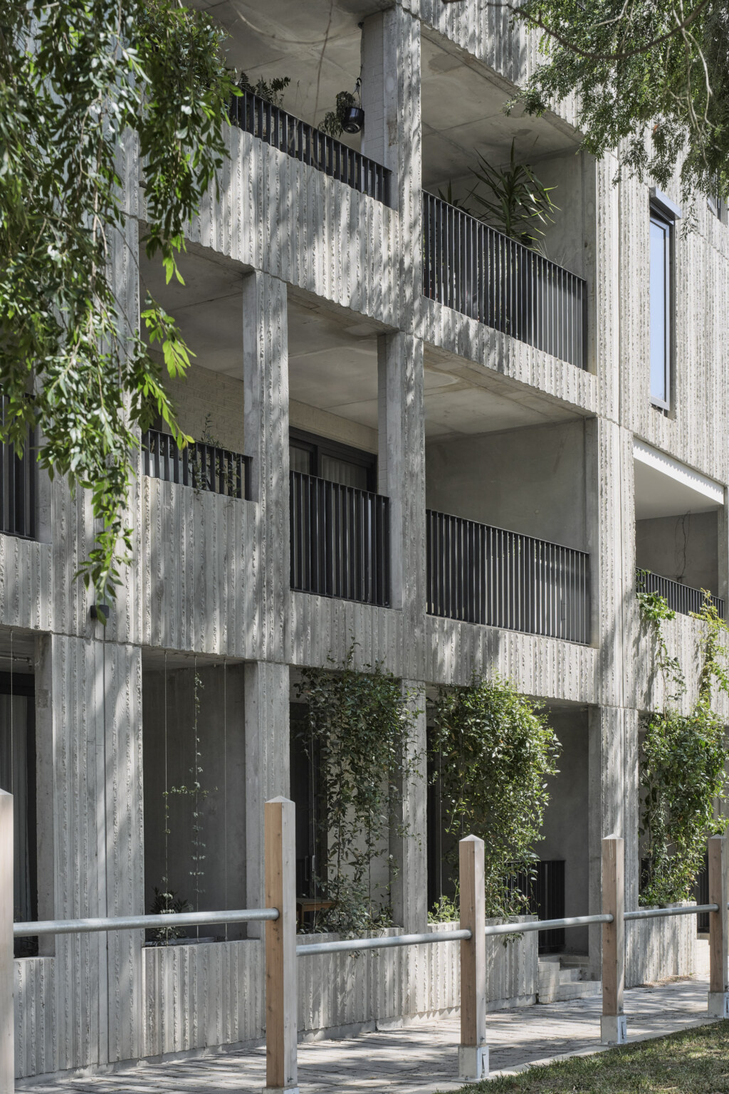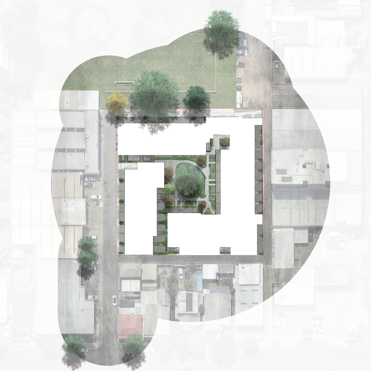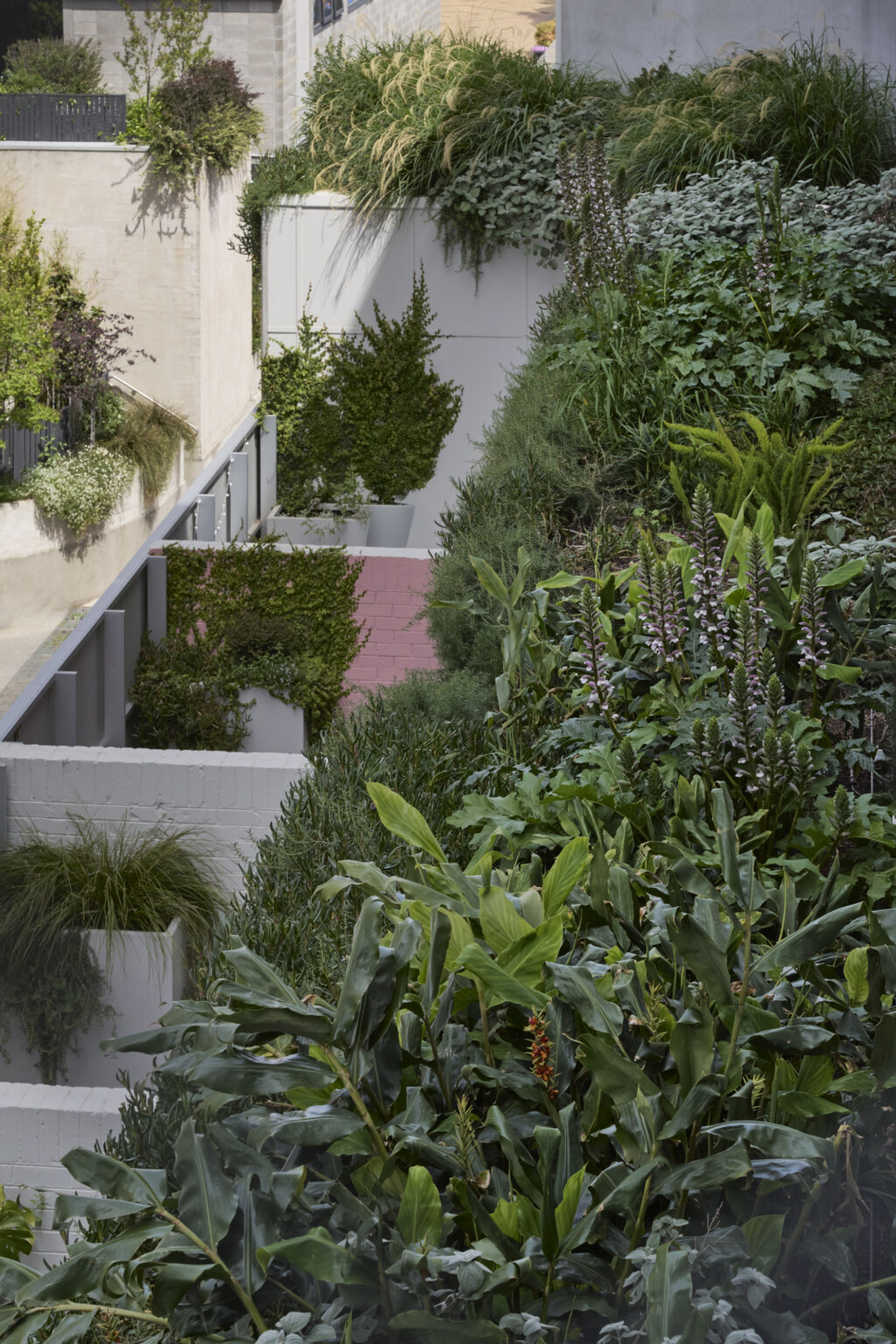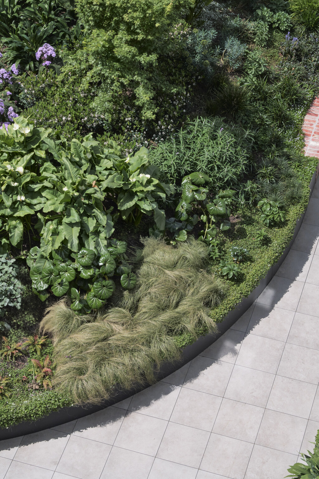 This is a building arranged around a green centre. Little Miller Street is a multiple residential project adjacent to Balfe Park in Brunswick. The brief called for a massing response on a square site that created its own internal amenity. The scheme re-imagines medium density living as something wrapped around and a connected to a central courtyard space suspended above a level of carparking below. This space functions as shared address to homes that front it on level 1 and that acts as a constantly changing visual amenity for the apartments above which look upon it. Openwork’s landscape design establishes a generous, green courtyard that binds four architecturally distinct buildings into a single neighbourhood. A new blue stone laneway along Balfe Park extends the civic realm, improving permeability and public amenity while embedding the project within Brunswick’s fine-grain fabric. Productive planting, permeable surfaces, and shaded microclimates foster ecological resilience and community life. From ground-level town houses to rooftop terraces, the landscape supports daily routines with landscape at their centre — a living infrastructure for a low-carbon, car-light future.