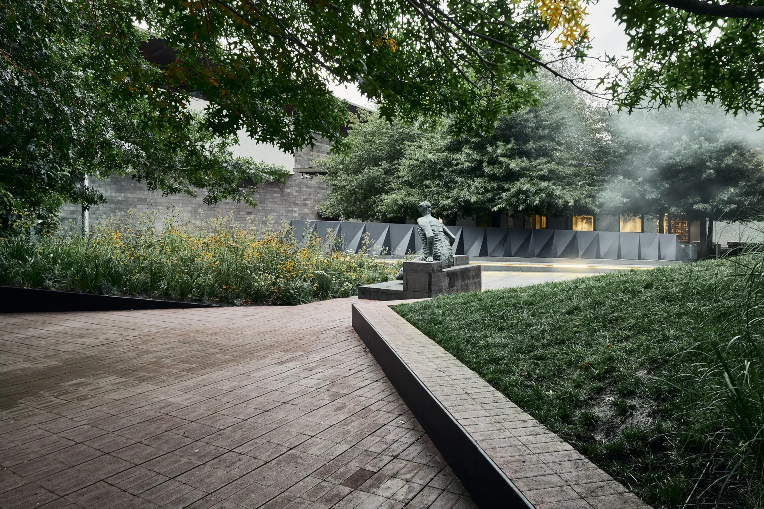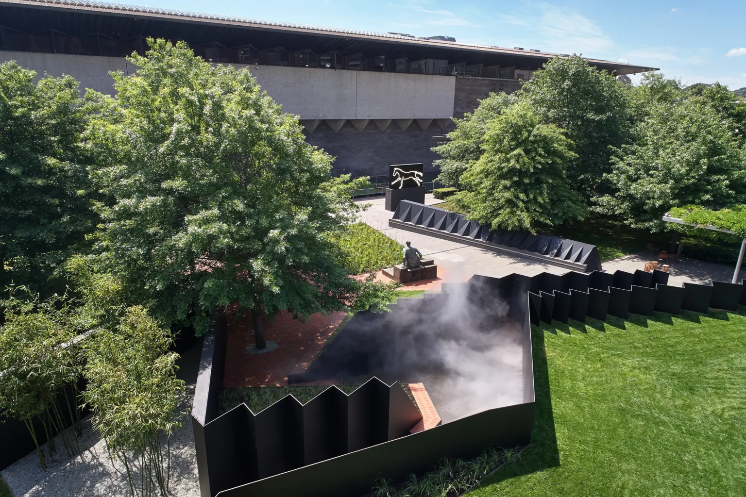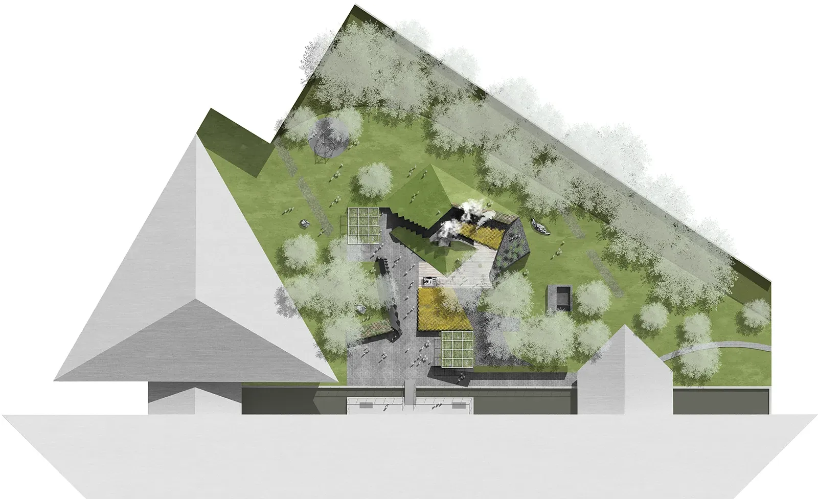 This is a project about small moves recasting big territories. Doubleground is the 2018 NGV Architecture Commission and was located in the sculpture garden of Roy Grounds’ National Gallery of Victoria. It is a response to Gallery’s brief to create a temporary, site-specific work in its sculpture garden over summer. As an intervention, the project specifically seeks to challenge the role of the garden. Rather than an object in the garden, it is the landscape that generates interiors and rooms and, by burying, reveals a new kind of architecture. Collage is used as a tool for stitching together a formal memory of the pre-Bellini NGV building or a memory of it blurred by time. Lines in the collage become walls and the walls occasion tectonic folds in the turf plane of the garden, re-formalizing an architectural memory from what was. The project is not about making spaces that are performative but rather spaces that offer invitation, are explored and passed through-spaces for the body: a room, a corridor and a field. Doubleground shows the way in which small scale, low cost, collaborative and multi-disciplinary interventions can create tipping points within an existing landscape condition that comprehensively transform that landscape’s ability to invite, hold and engage visitors.