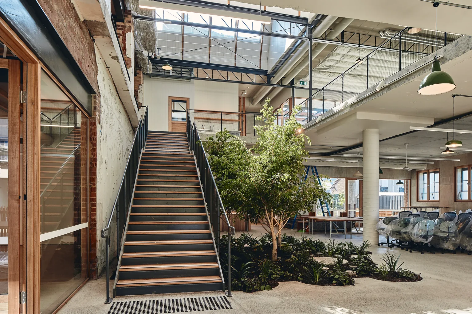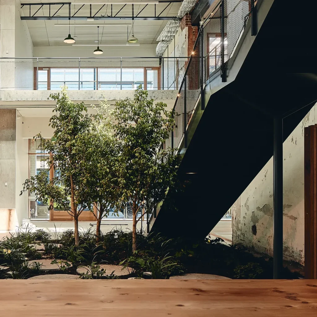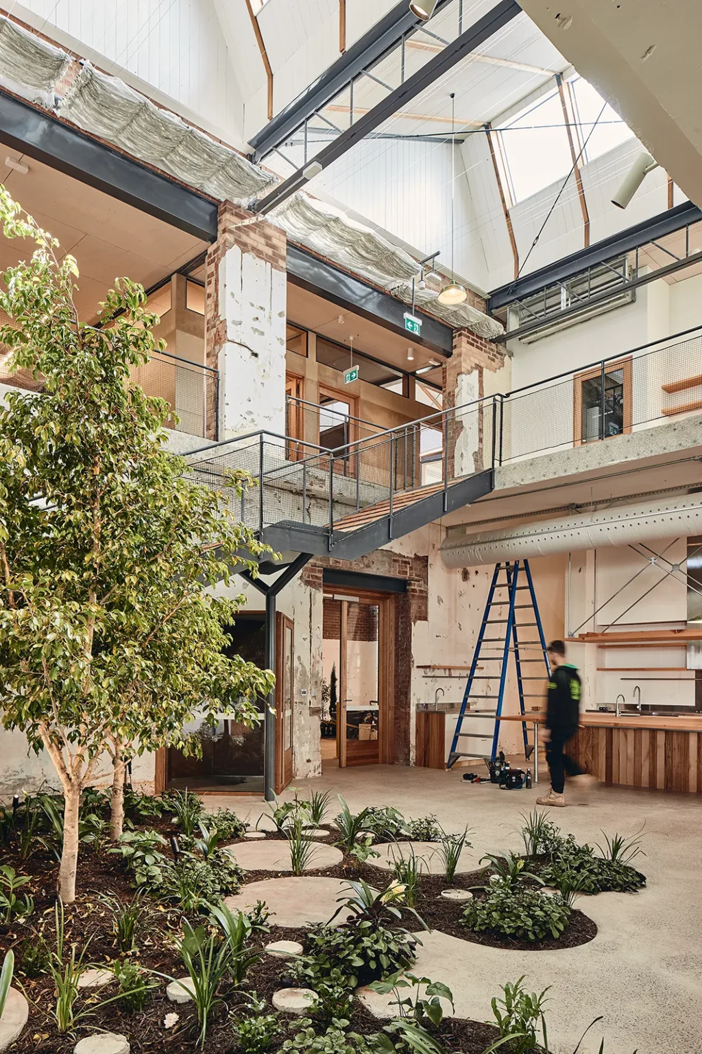 This is what old buildings can give. Sanders Place is a retrofit of a two-storey industrial building in Richmond. As a plus energy retrofit the brief was to provide an exemplar of what can be done to any industrial or office building, small or large that has reached the end of its current use. The fabric of the building has been retained and five courtyards cut into its envelope, bringing the outside inside and allowing the building to breathe. The biggest hole saw available was used to perforate the existing ground floor slab to reveal the natural soil underneath, which now hosts a new garden – growing through another void cut in the slab above. Cut concrete, salvaged bricks and cores have been retained on site and become the material stuff of the garden. The main stair through the void is grounded in this new garden making it something for all visitors and workers to engage with. This direct engagement with landscape, seasonality and biophilia is at the centre of the project and recasts the commercial as something kinder and more like home. All concrete leftover from cutting was kept and has been redeployed as the material of the landscape. Brick salvaged from the demolished wall is given a new life as surprisingly ornate paving. Planting is opportunistic and eclectic and will in time grow through the void space of the outer courtyards.