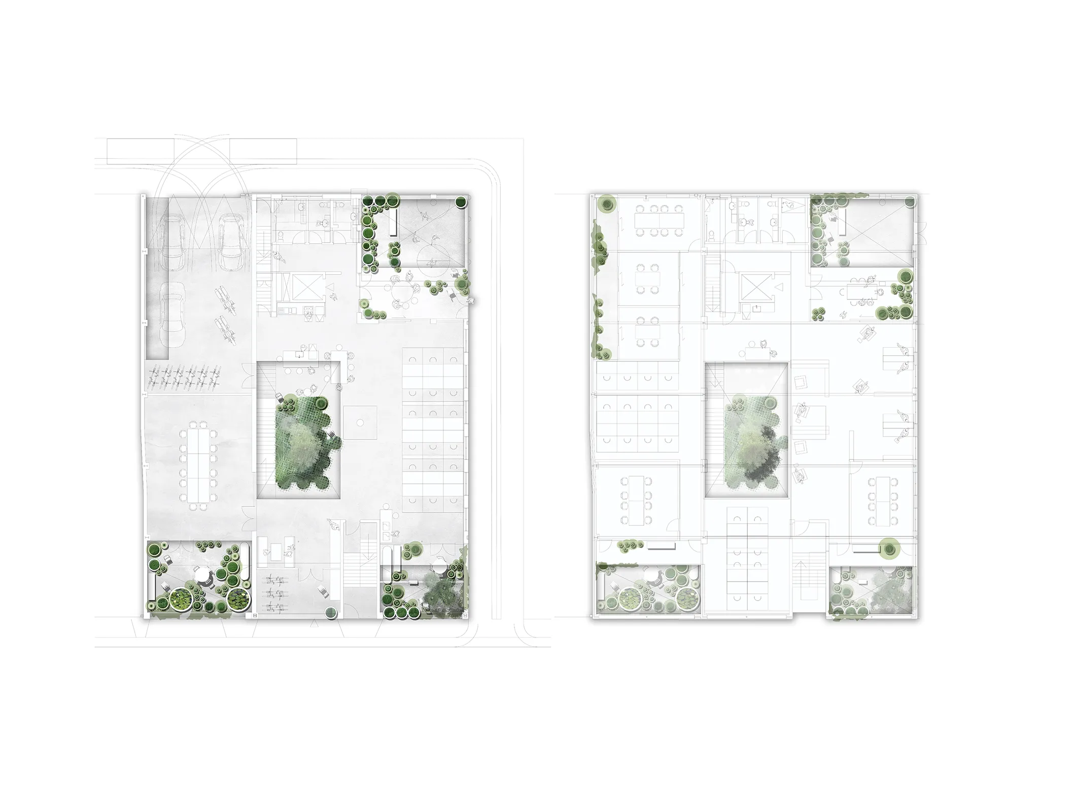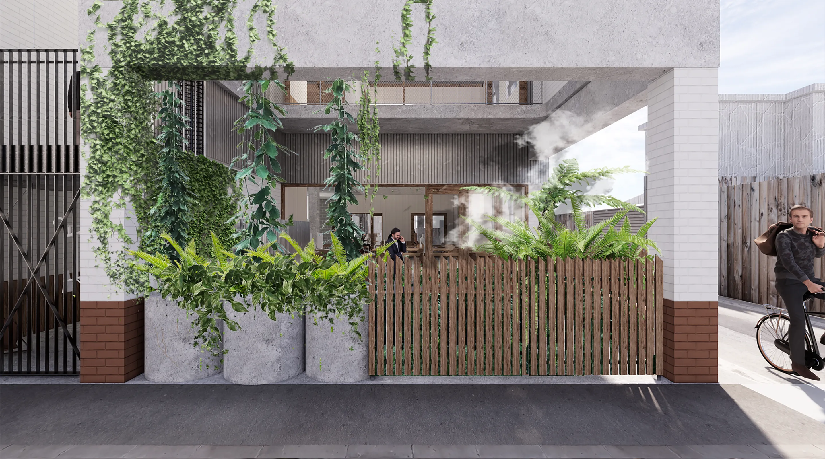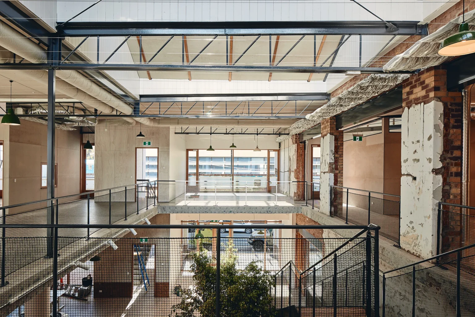 This is what old buildings can give. Sanders Place is a retrofit of a two-storey industrial building in Richmond. As a plus energy retrofit the brief was to provide an exemplar of what can be done to any industrial or office building, small or large that has reached the end of its current use. The fabric of the building has been retained and five courtyards cut into its envelope, bringing the outside inside and allowing the building to breathe. The biggest hole saw available was used to perforate the existing ground floor slab to reveal the natural soil underneath, which now hosts a new garden – growing through another void cut in the slab above. Cut concrete, salvaged bricks and cores have been retained on site and become the material stuff of the garden. The main stair through the void is grounded in this new garden making it something for all visitors and workers to engage with. This direct engagement with landscape, seasonality and biophilia is at the centre of the project and recasts the commercial as something kinder and more like home. All concrete leftover from cutting was kept and has been redeployed as the material of the landscape. Brick salvaged from the demolished wall is given a new life as surprisingly ornate paving. Planting is opportunistic and eclectic and will in time grow through the void space of the outer courtyards.