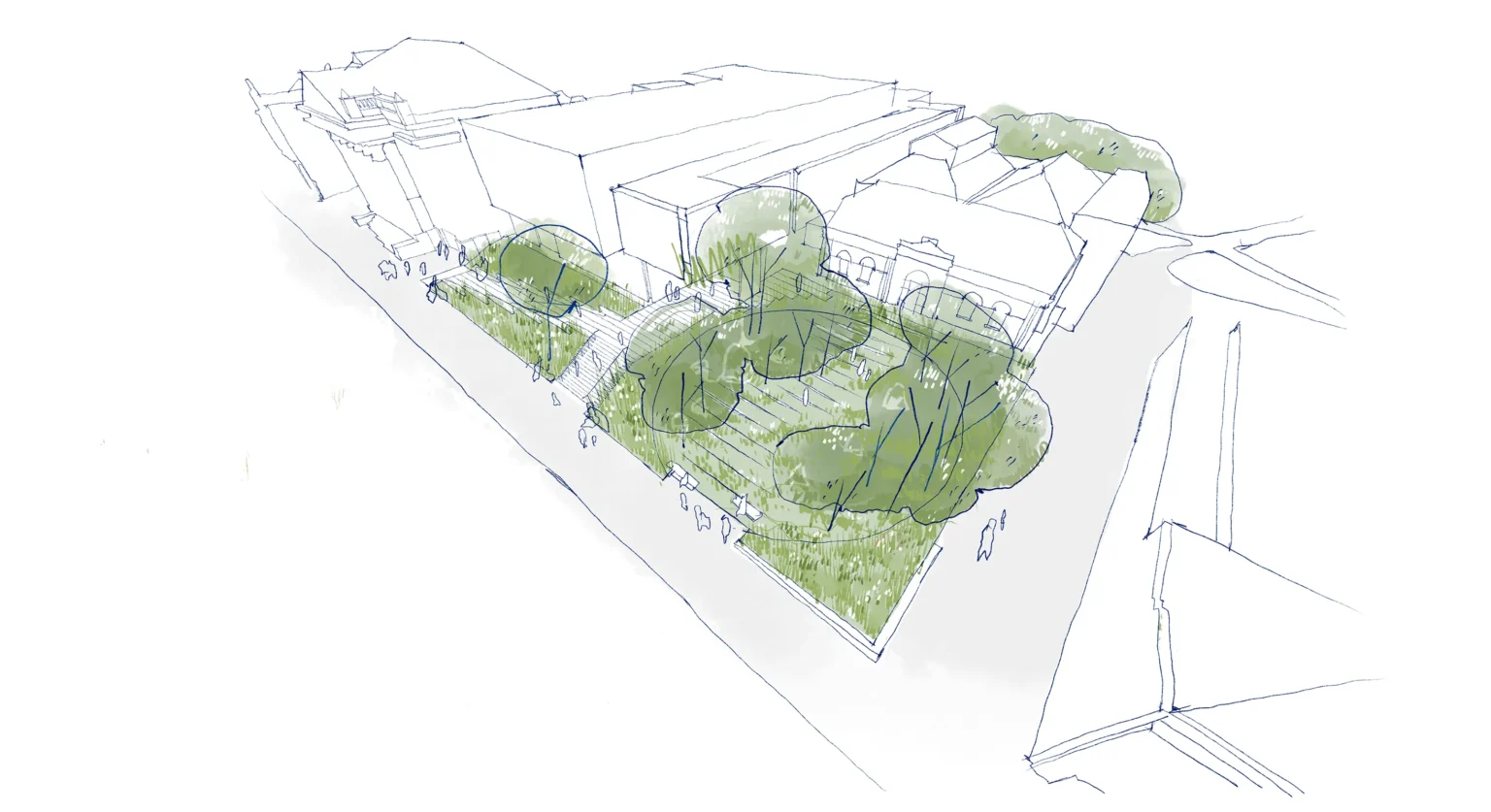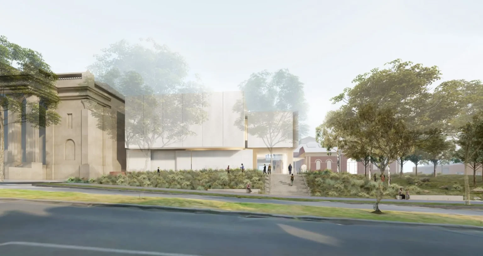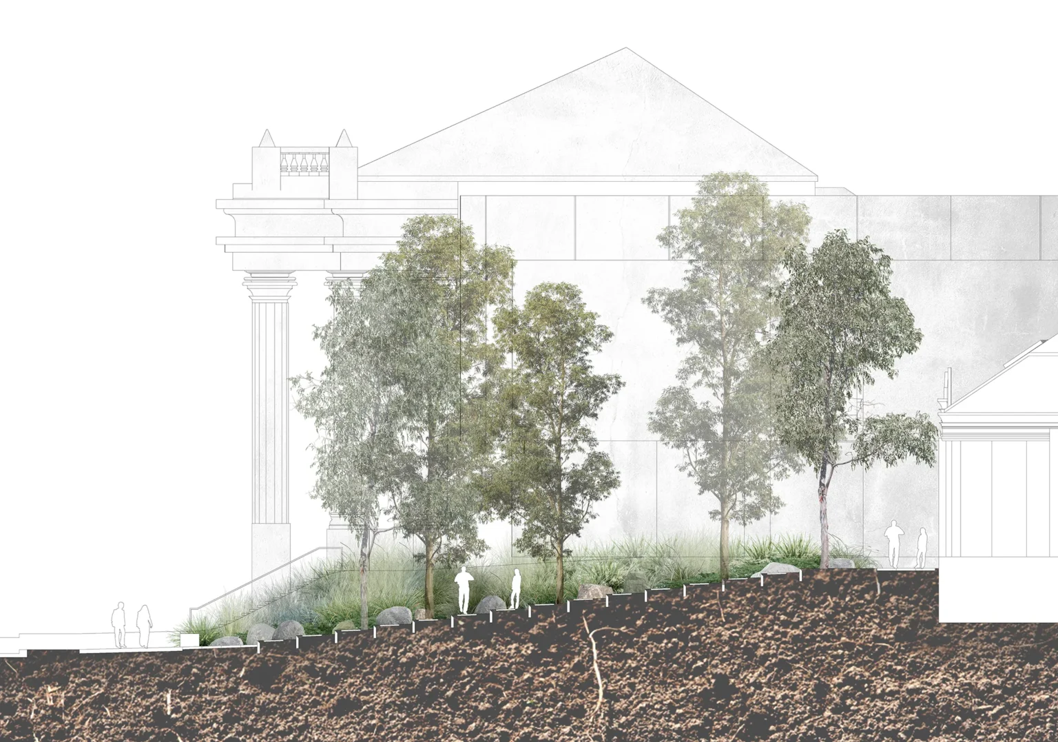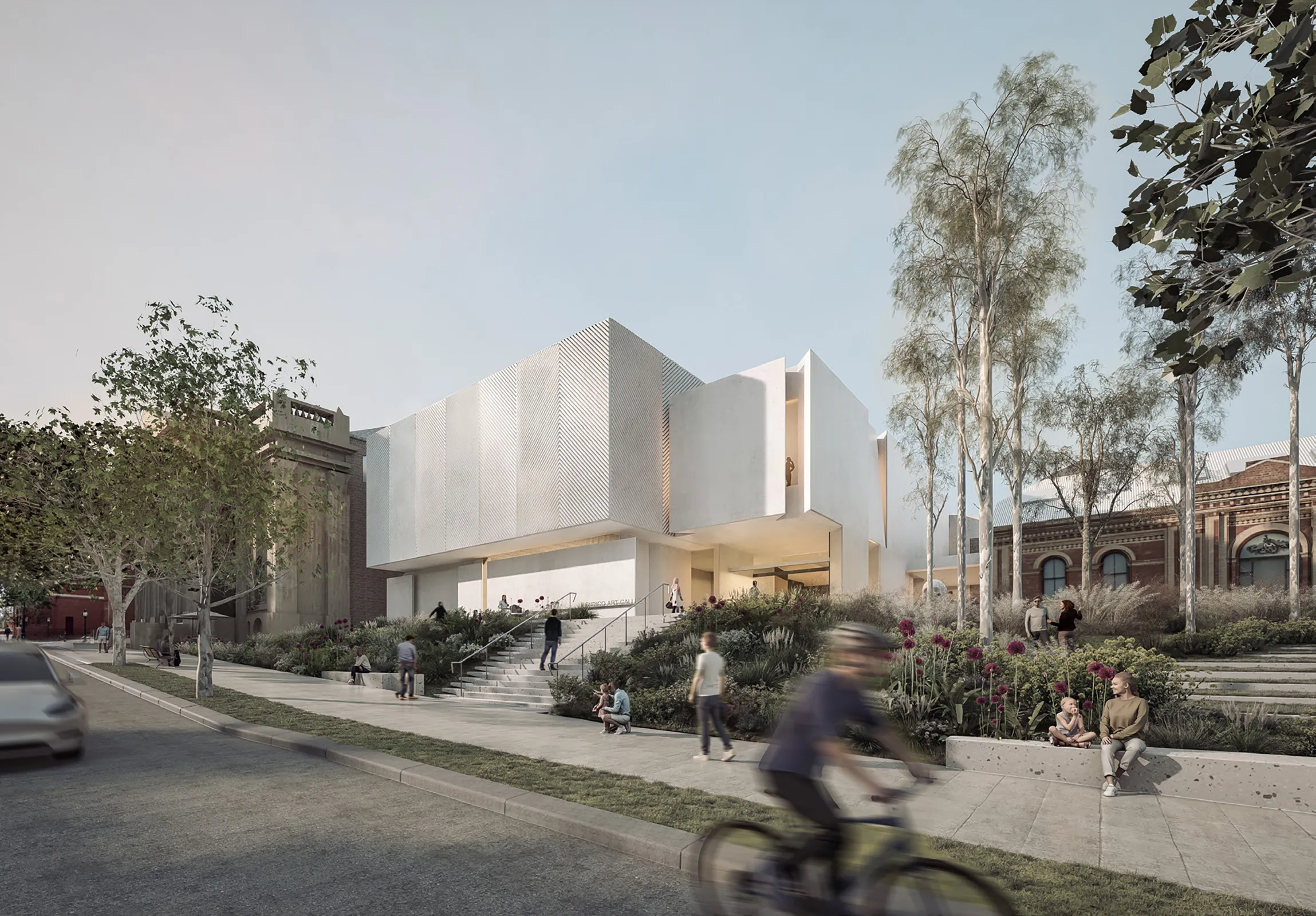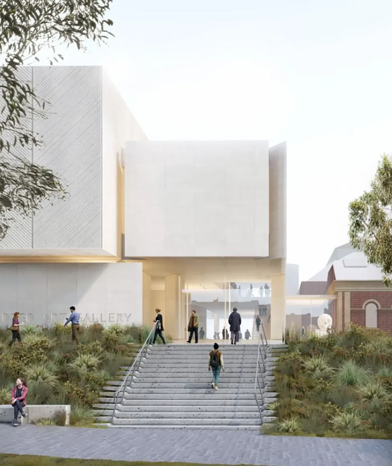This is a space between two colonial landscapes. The new Bendigo Art Gallery is located between View Street and Rosalind Park. Our proposal provides a landscape that is a companion to the rejuvenated Gallery, that grounds it in place and that provides a new landscape language that can negotiate between the colonial civic of the street and the exotic picturesque of the park. We see that new language as being an old language – made from the elements of the site’s pre-colonial ecology. The landscape of the Bendigo Gallery will be an immersive threshold that allows visitors to leave the familiar space of the city, to change the speed of their body and to prepare for exposure to great art. Our approach foregrounds notions of designing from Country. The View Street address is a space that acknowledges the heritage of the Bolton Court Gallery, but its former materials of asphalt, turf and European trees are replaced by a restored ecology of Box Ironbark Forest. This is a new garden that can be used by Traditional Custodians as a codex – a place for keeping and demonstrating Indigenous Knowledge about foods, seasonality and materiality, as well as being a site for displaying art. The landscape scheme, developed in collaboration with the Dja Dja Wurrung, contributes to local biodiversity by massively increasing the number and diversity of plant species included within the City.