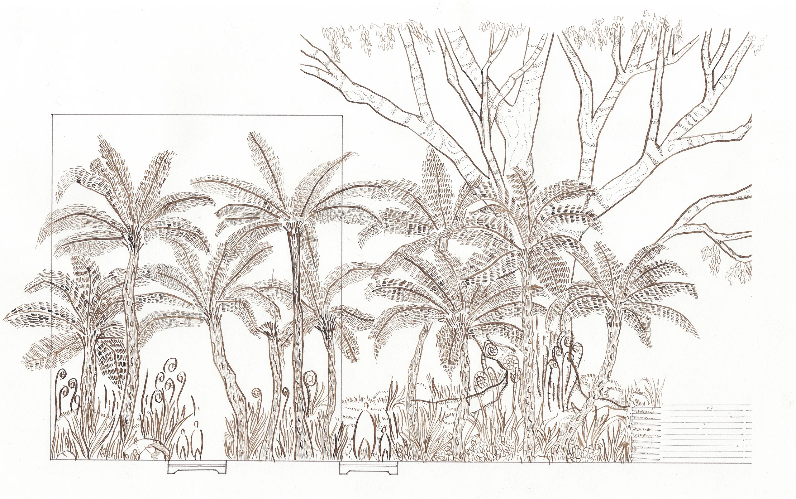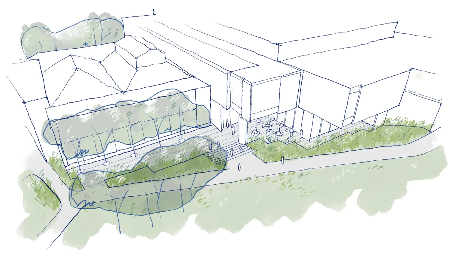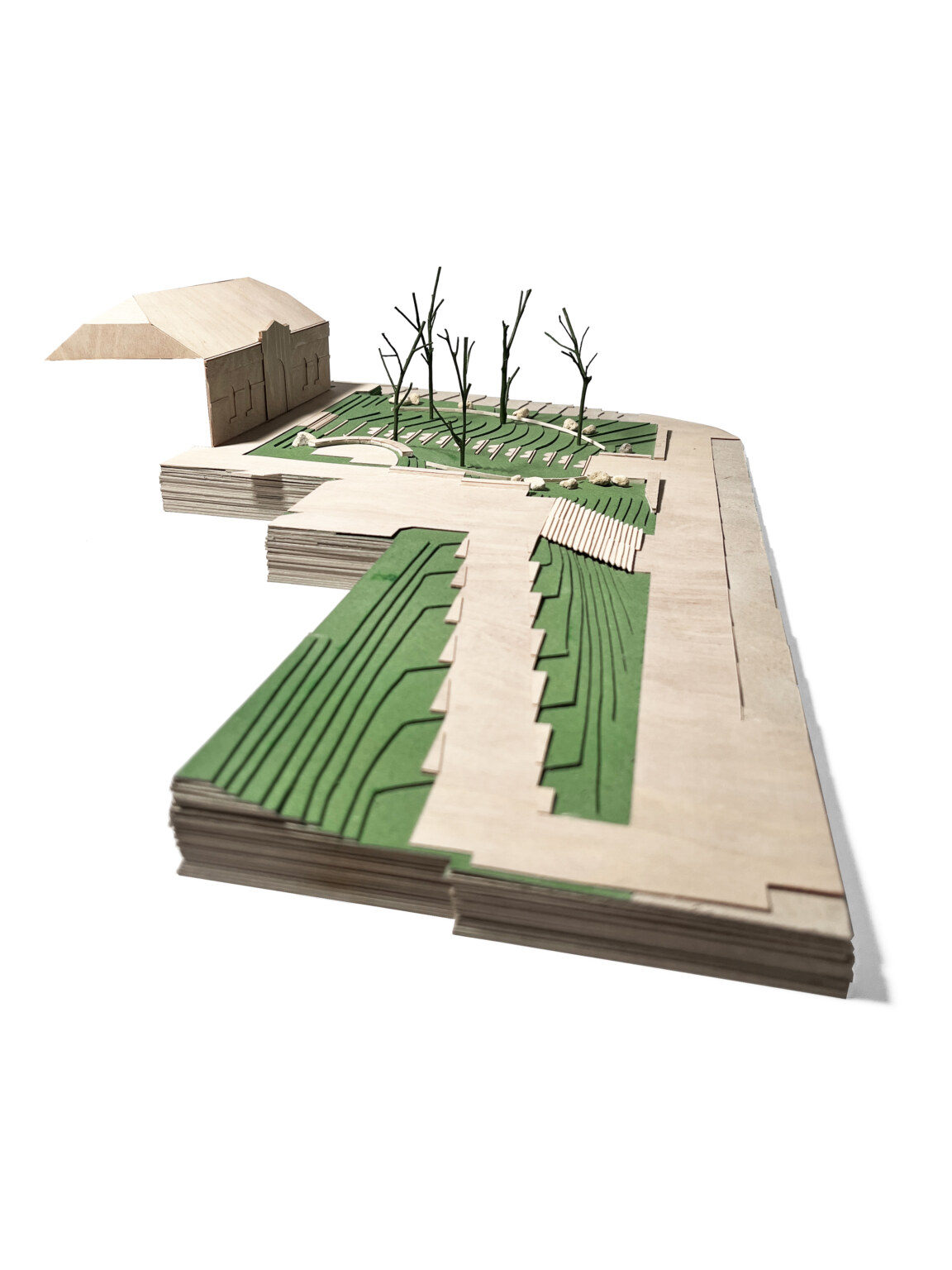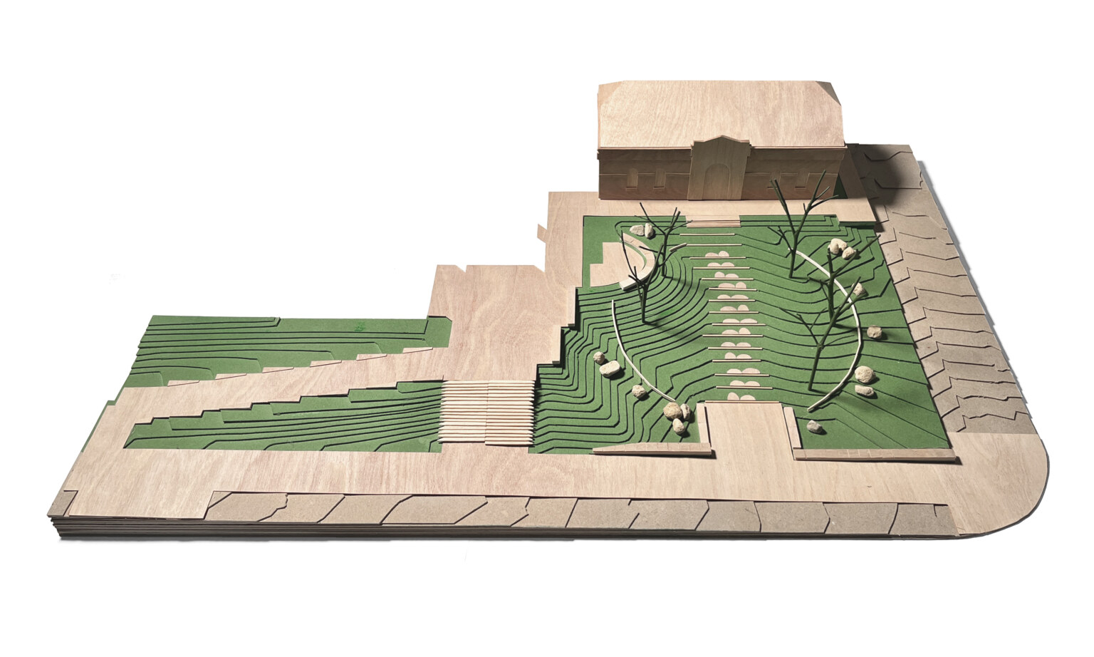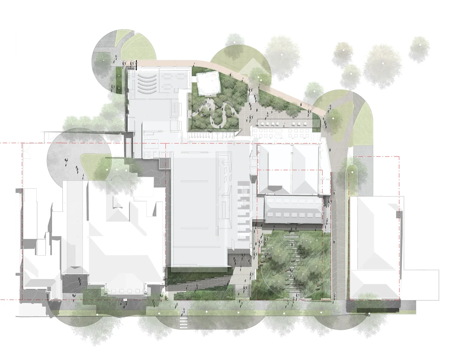 This is a space between two colonial landscapes. The new Bendigo Art Gallery is located between View Street and Rosalind Park. Our proposal provides a landscape that is a companion to the rejuvenated Gallery, that grounds it in place and that provides a new landscape language that can negotiate between the colonial civic of the street and the exotic picturesque of the park. We see that new language as being an old language – made from the elements of the site’s pre-colonial ecology. The landscape of the Bendigo Gallery will be an immersive threshold that allows visitors to leave the familiar space of the city, to change the speed of their body and to prepare for exposure to great art. Our approach foregrounds notions of designing from Country. The View Street address is a space that acknowledges the heritage of the Bolton Court Gallery, but its former materials of asphalt, turf and European trees are replaced by a restored ecology of Box Ironbark Forest. This is a new garden that can be used by Traditional Custodians as a codex – a place for keeping and demonstrating Indigenous Knowledge about foods, seasonality and materiality, as well as being a site for displaying art. The landscape scheme, developed in collaboration with the Dja Dja Wurrung, contributes to local biodiversity by massively increasing the number and diversity of plant species included within the City.