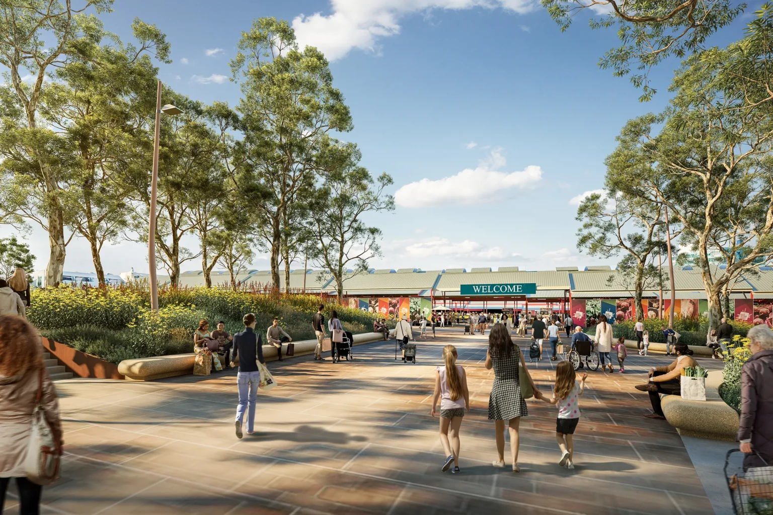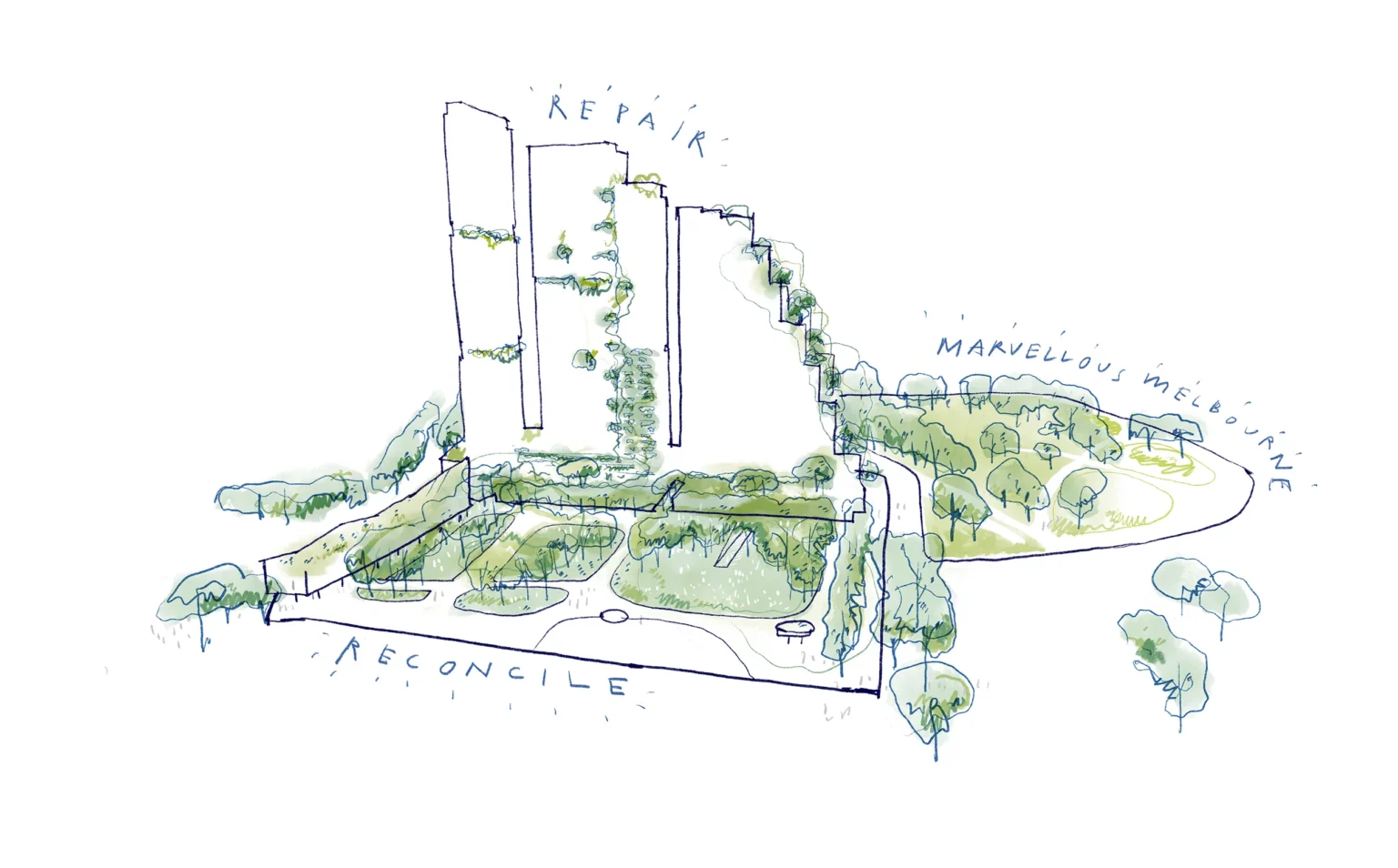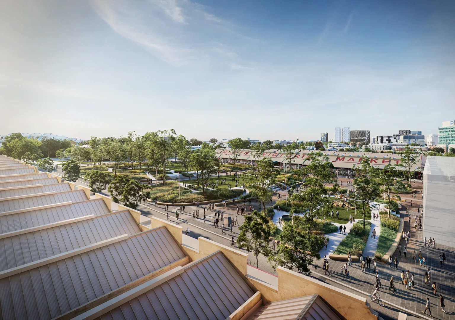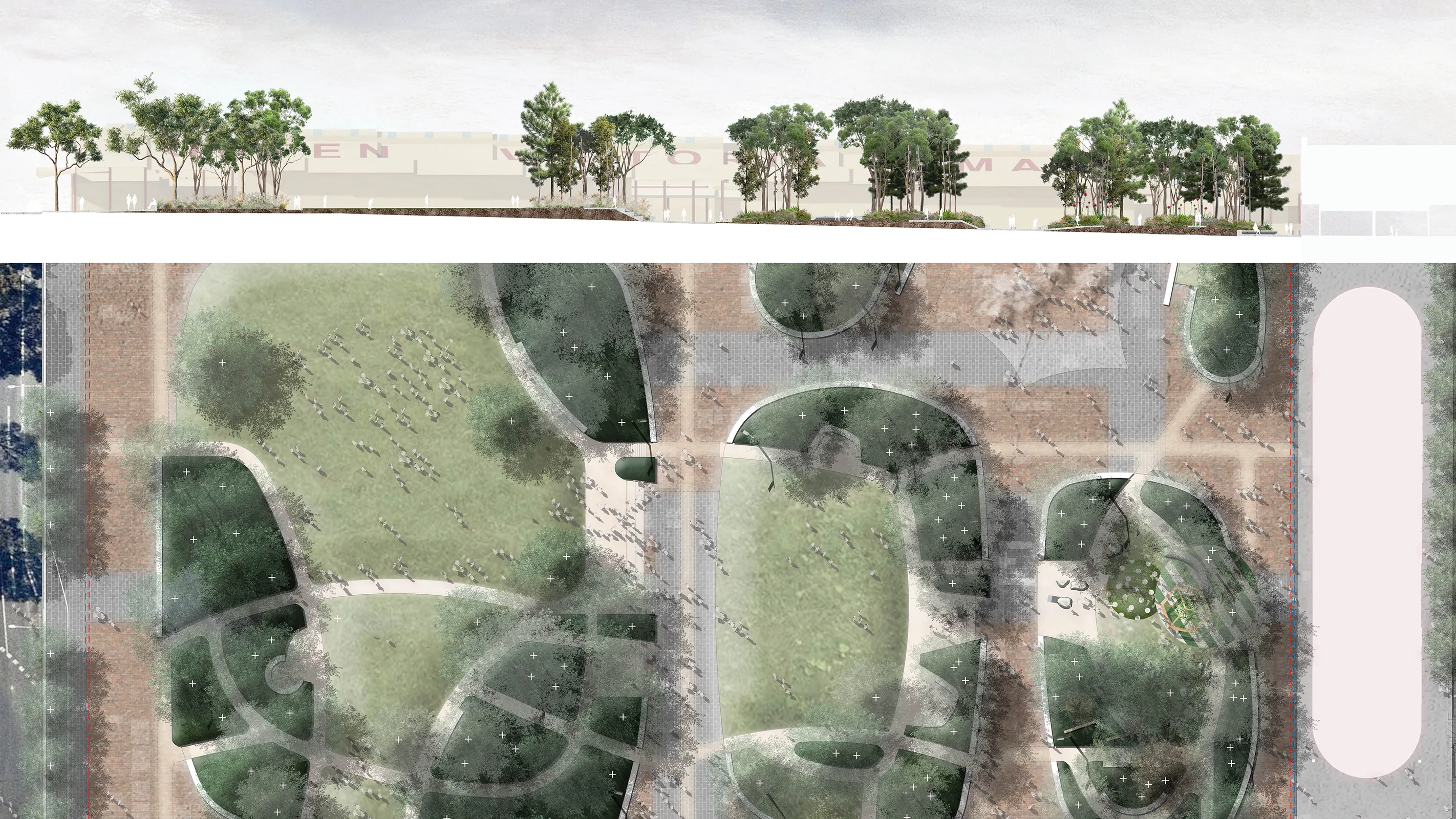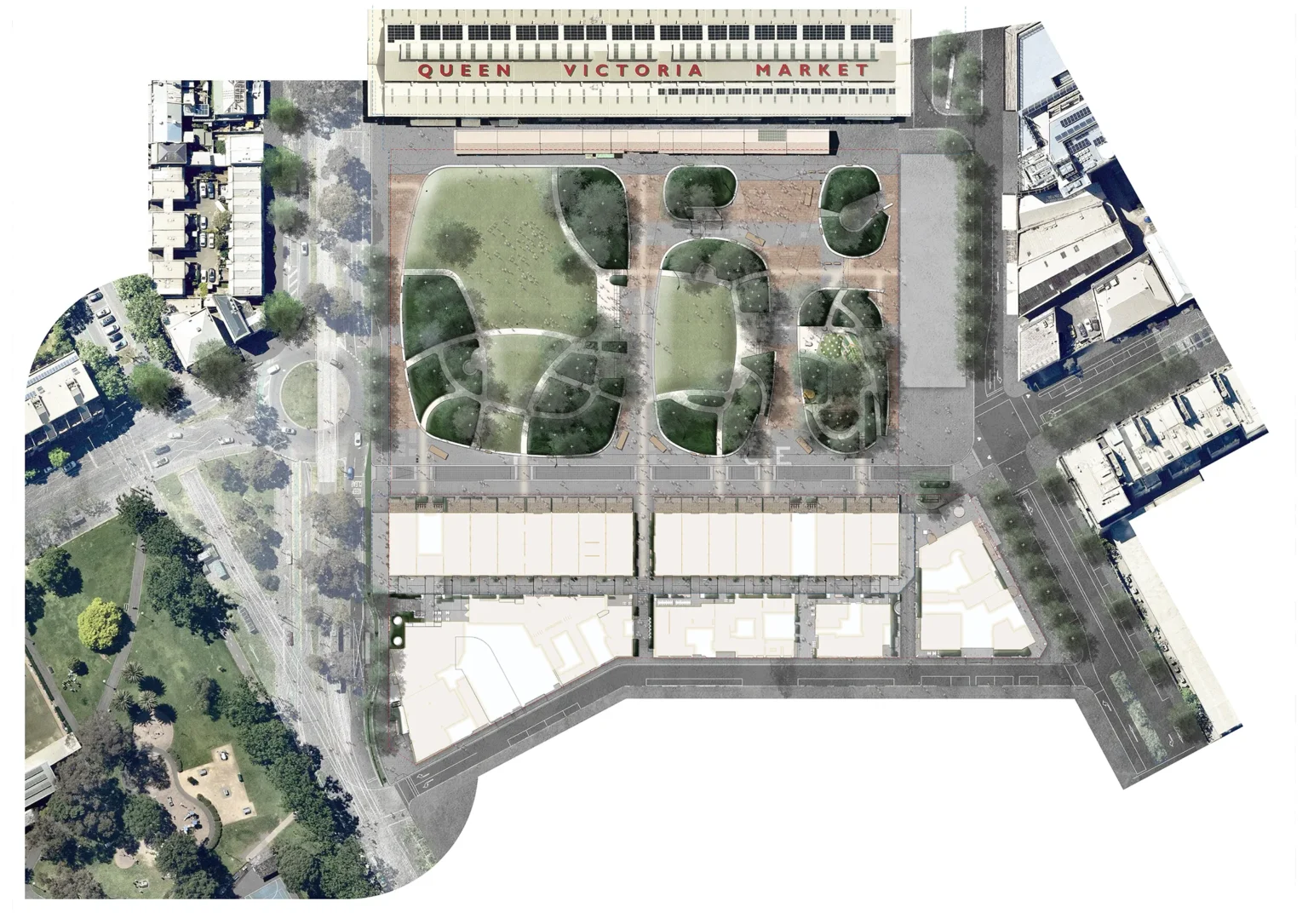 This is a place that honours the living and the dead. Market Square occupies the zone between Queen Street, Peel Street, Queen Victoria Market (QVM) and the Franklin Street Stores. The brief is to transform the current QVM carpark into a two-hectare open space that embodies the City of Melbourne’s QVM Design Charter. The site is characterised by being a visible and active part of the Market Precinct, and by being an invisible remnant of the former Old Melbourne Cemetery, with interred remains still present under the surface of the asphalt car park. Market Square will be a new type of open space in Melbourne. By combining the spatial complexity of Melbourne’s 19th Century gardens along with the flexibility of its 20th Century ones, Market Square will enable gathering and opportunities for informal recreation, rest and quiet reflection. It will work carefully to ensure that the existing sub-grade is undisturbed, creating a space of exchange between old and new, between landscape and architecture and between Country and sky. The ambition of the landscape design is to host nature, time, memory and people in a way that allows co-presence, richness and diversity, seeking to amplify the fundamental connection between space and the civic. The design for Market Square is currently the subject of consultation with the community, the City of Melbourne and other Government agencies.