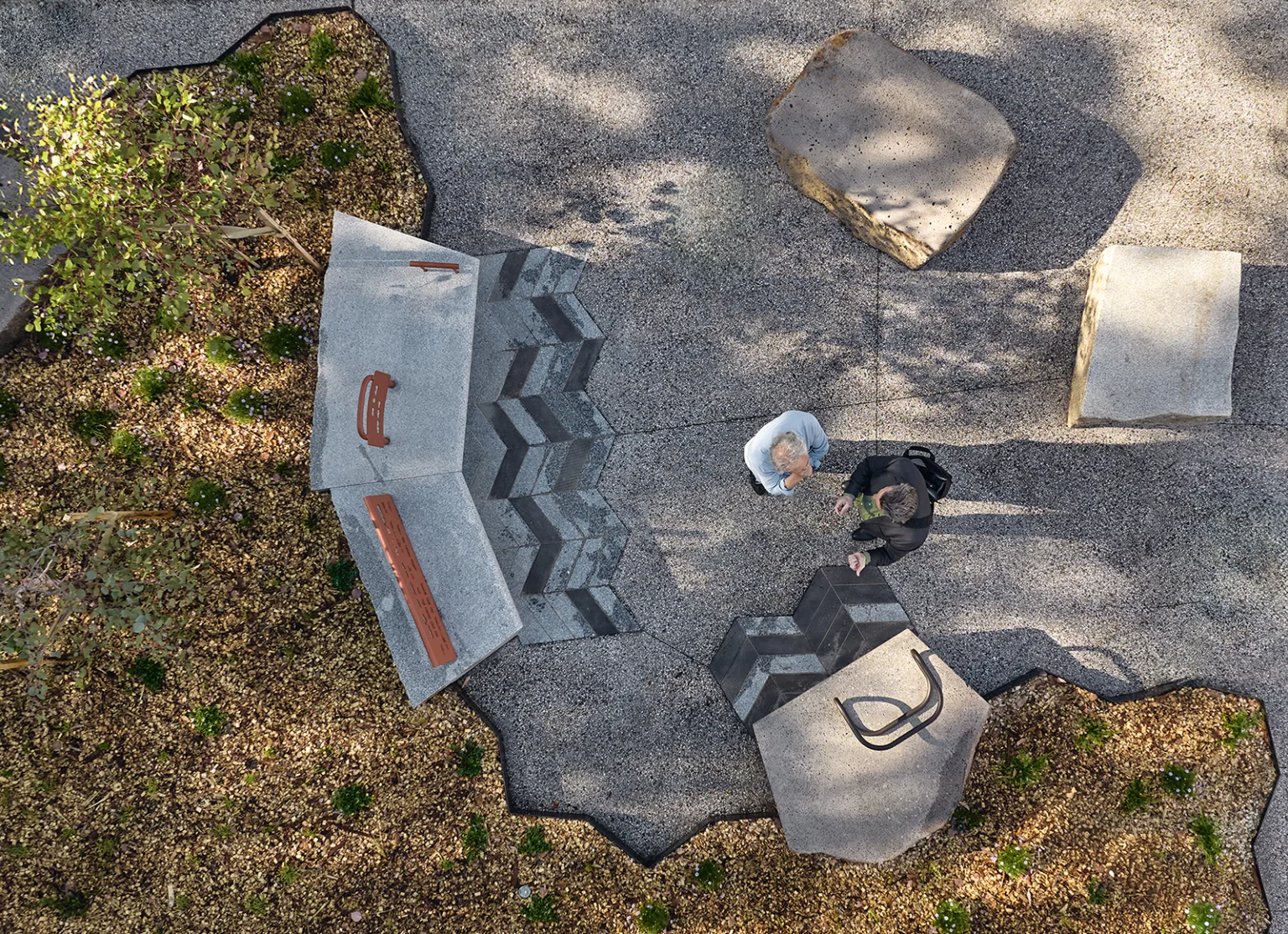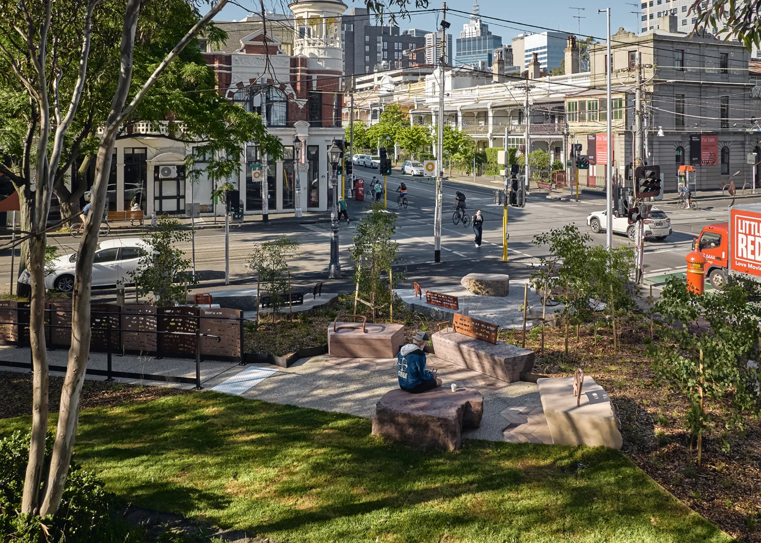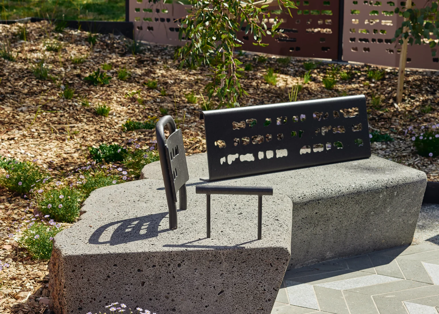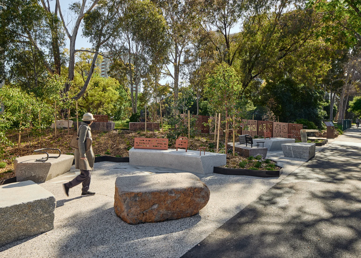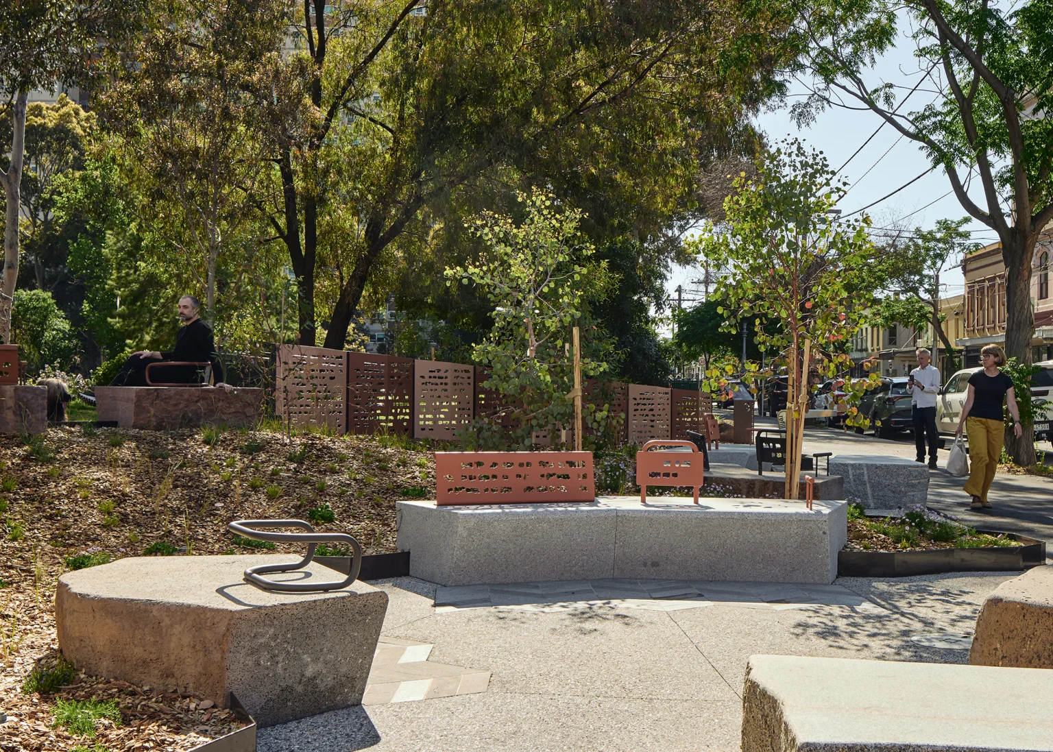 This is the diaspora of Fitzroy. The City of Yarra’s brief called for a new public space at the corner of Gertrude and Brunswick Streets. The heavy shrubs that have forever held the street apart from the Atherton Gardens Estate were removed and replaced by a new topography which spills out from Atherton Gardens to meet the footpath. A series of spaces are carved out and embedded within this new and densely planted landform. A new ramp allows access to the top of the Gardens and an uninterrupted view across the estate’s parkland – a significant space for the Aboriginal community in Melbourne, serving for decades as a meeting place, a centre for political activism, and a home for the many families and individuals who moved to the city from regional areas. The new public spaces host a diaspora of Victorian stone, cut and arranged to face significant places in the public and Aboriginal life of Fitzroy. An eccentric collection of backs and armrests imply occupation and offer an invitation to perch and observe the street and the long vista of the parklands to the east. In time, new trees will shade the footpath and the street. The ambition is that this place will endure – holding the corner, resisting future change within the Estate, and remaining a space of exchange and gathering.