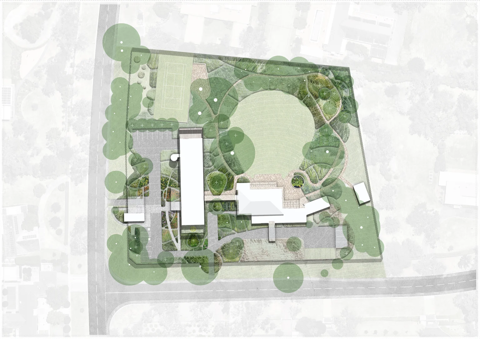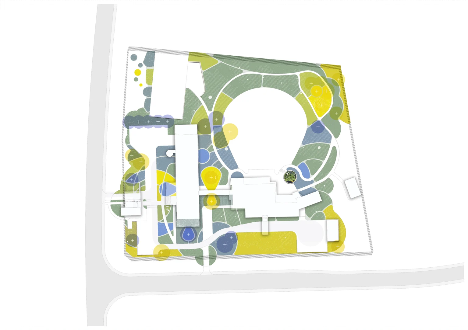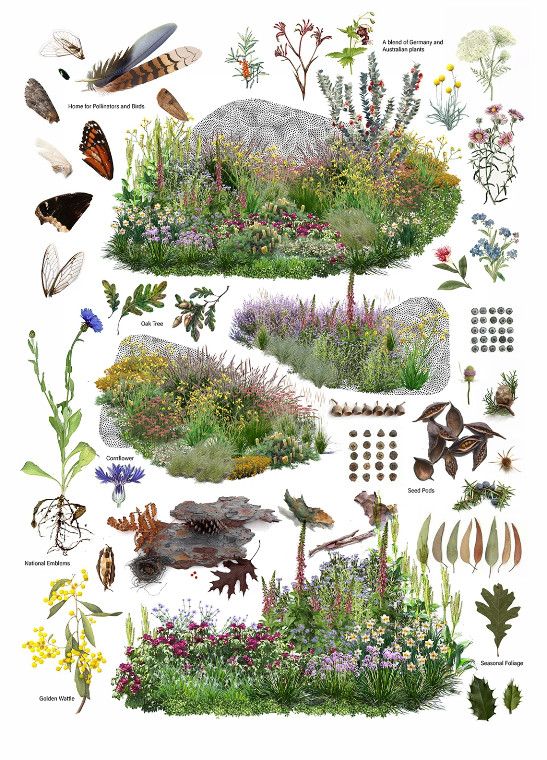 This is a garden of intermingled natures. The competition for a new German Chancellery in Canberra called for changes to the existing campus. Our proposal starts with an acknowledgement of the twin custodianship of the land upon which the Embassy is located – administratively the domain of the Bundesrepublik Deutschland and perpetually a part of Ngambri Country. In what we’ve called an “intermingled nature”, the planting of our project shifts from areas that foreground German plants to areas that foreground Australian plants. In between, plants of both nations share planting beds selected on common characteristics – the blue purple Kornblume co-planted with purple Scaevola aemula ‘Aussie Crawl’ and the Yellow Iris alongside the prostrate Golden Wattle. We propose subtle interventions to the as-found landscape – amplifying the semi-circular lawn and changes to paths for universal access. The location of the new Chancellery building completes the western edge of the site, reinforcing the secluded charm of this ideal place for outdoor gatherings. For the outer landscape – between the site boundary and street frontage – we propose an intensely planted foreground, a beautiful entanglement of German and Australian Indigenous flora, a place that creates refuge, food, habitat and an embassy of sorts for non-human kin.