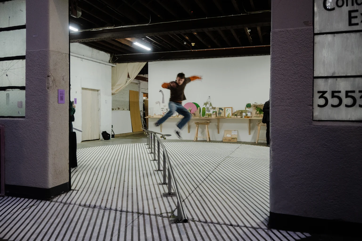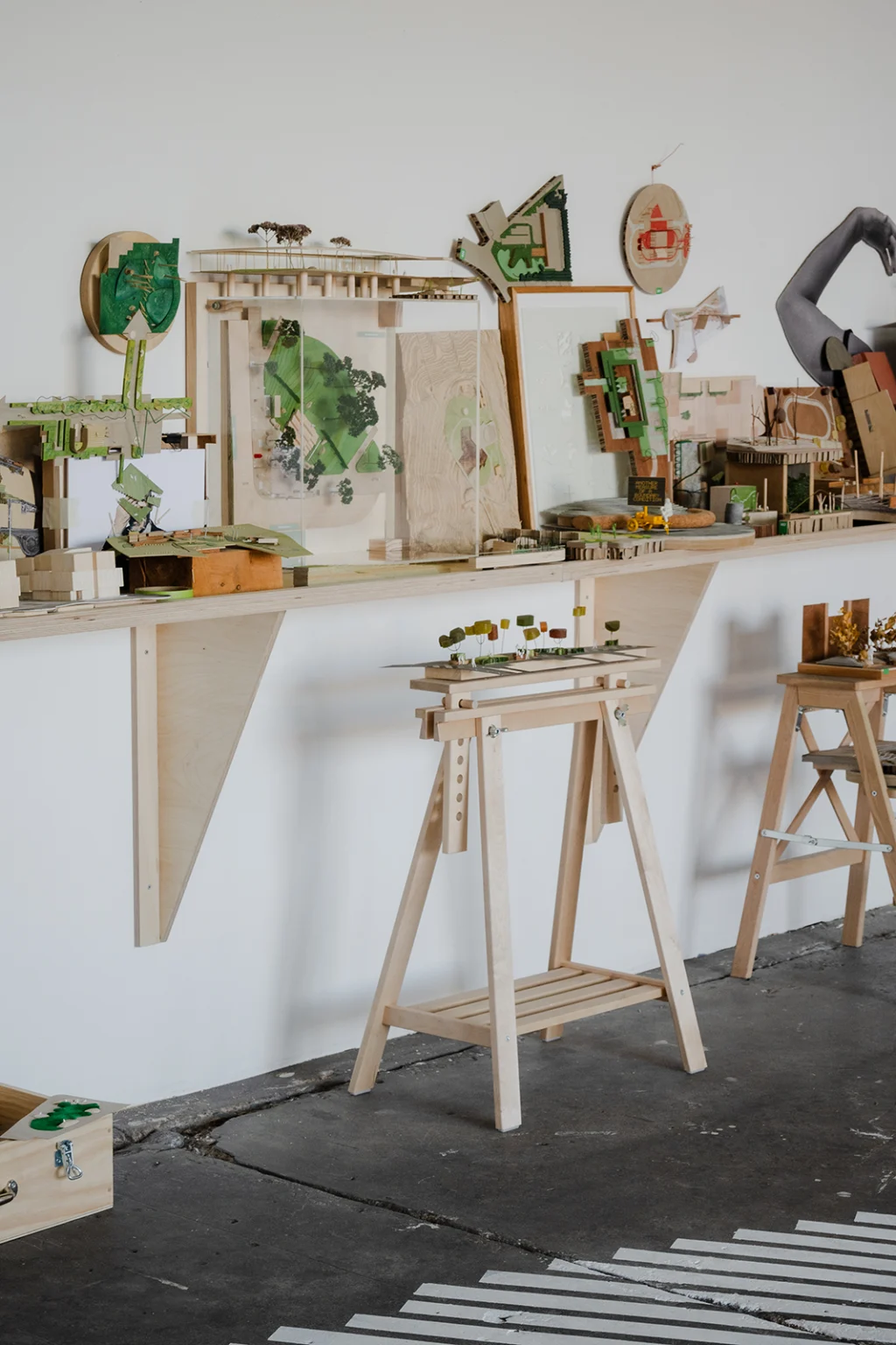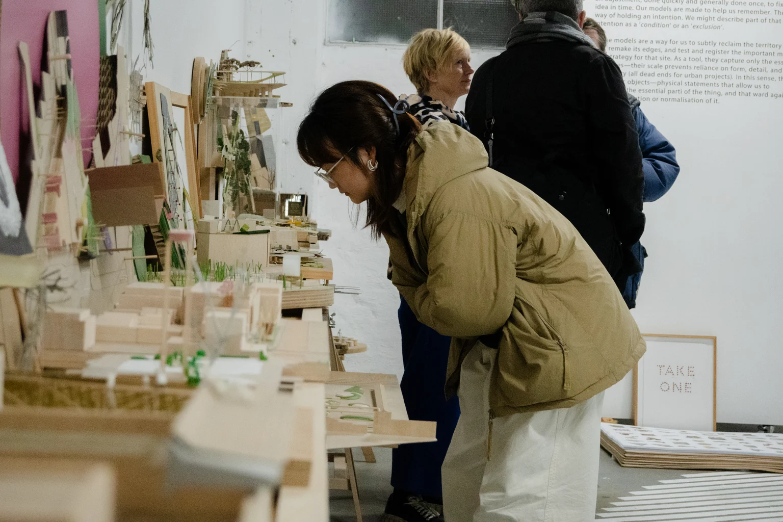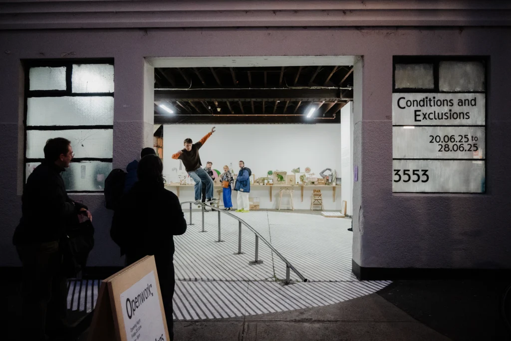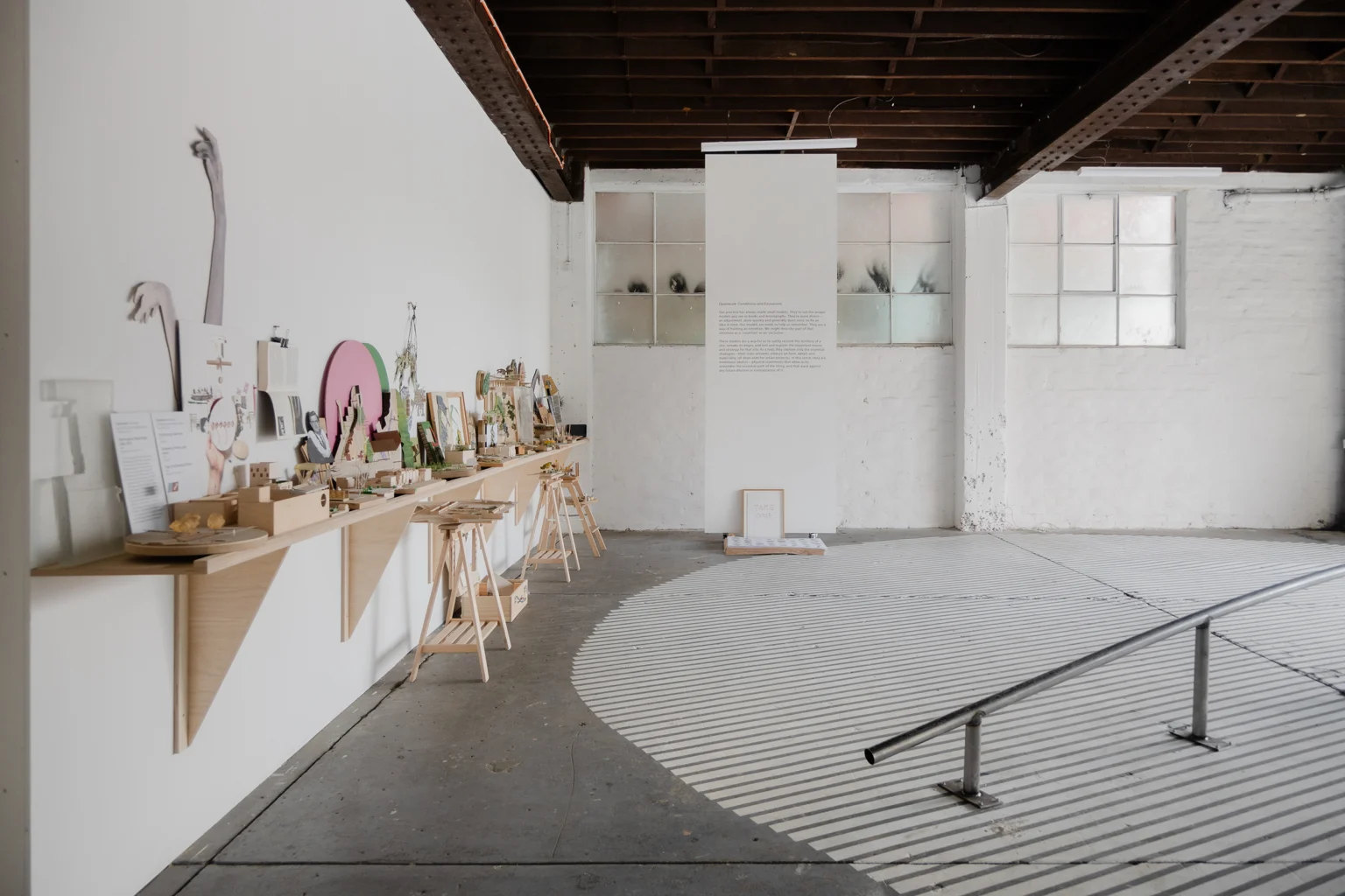 This is our show at 3553. Our practice has always made small models. They’re not the proper models you see in books and monographs. They’re done quickly and generally done once, to fix an idea in time. Our models are made to help us remember. They are a way of holding an intention. We might describe part of that intention as a ‘condition’ and/or an ‘exclusion’. A condition is about remaking the situation or site we’ve been asked to work in. An exclusion is about sneaking things into a design process that have been omitted from a brief. These models capture only essential strategies – their scale prevents reliance on form, detail, and materiality (all dead ends for urban projects). In this sense, they are mnemonic objects – physical statements that allow us to remember the essential parti of the thing, and that ward against any future dilution or normalisation of it. They have been displayed in groupings of colour. The painting on the floor of the gallery is a 1:1 drawing of our RMIT bollard (project 079) and the rail installed in the gallery is a section line through the bollard’s centre. It’s a way of permitting people skate on a thing that was originally designed to exclude them.