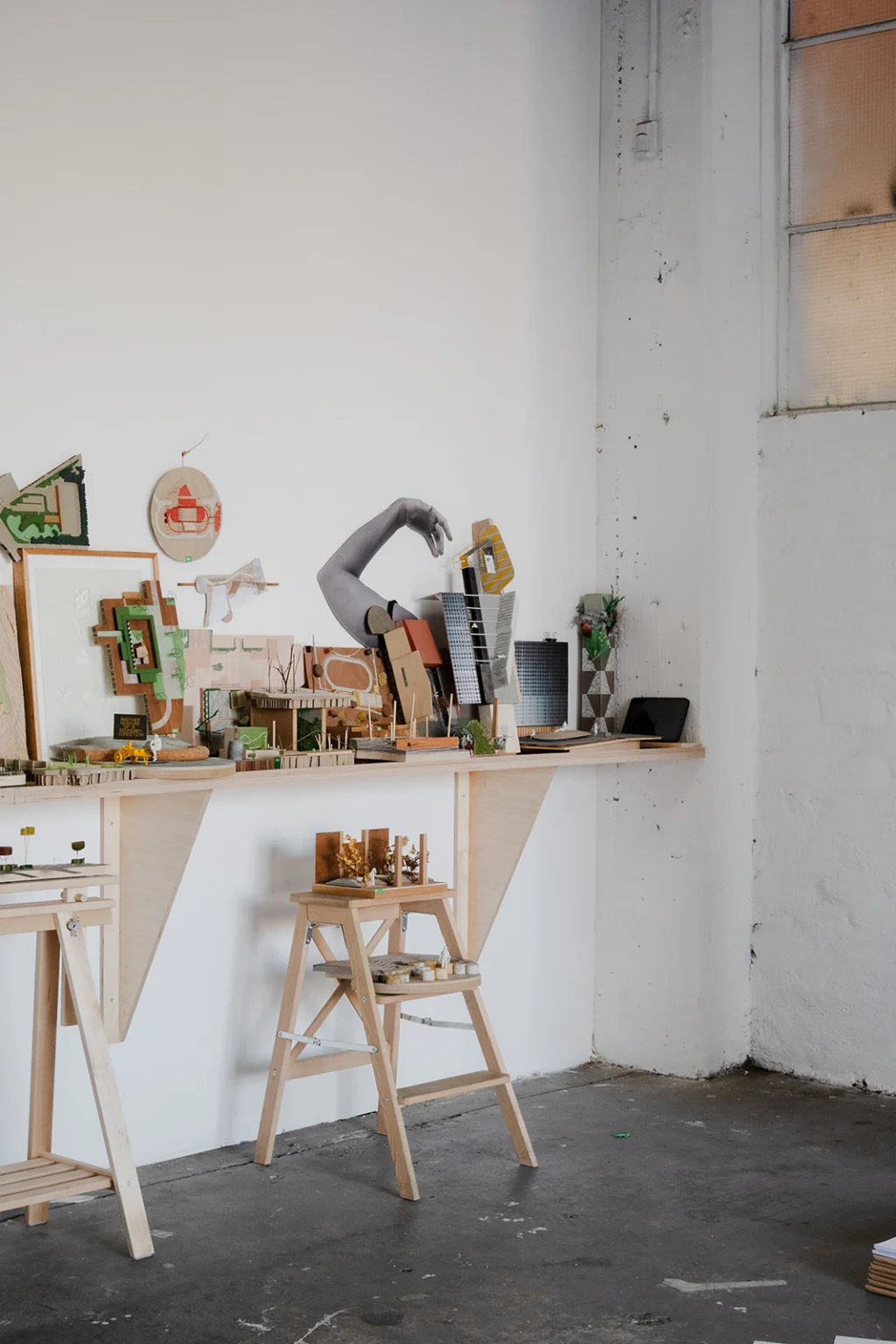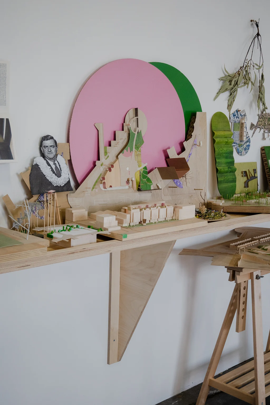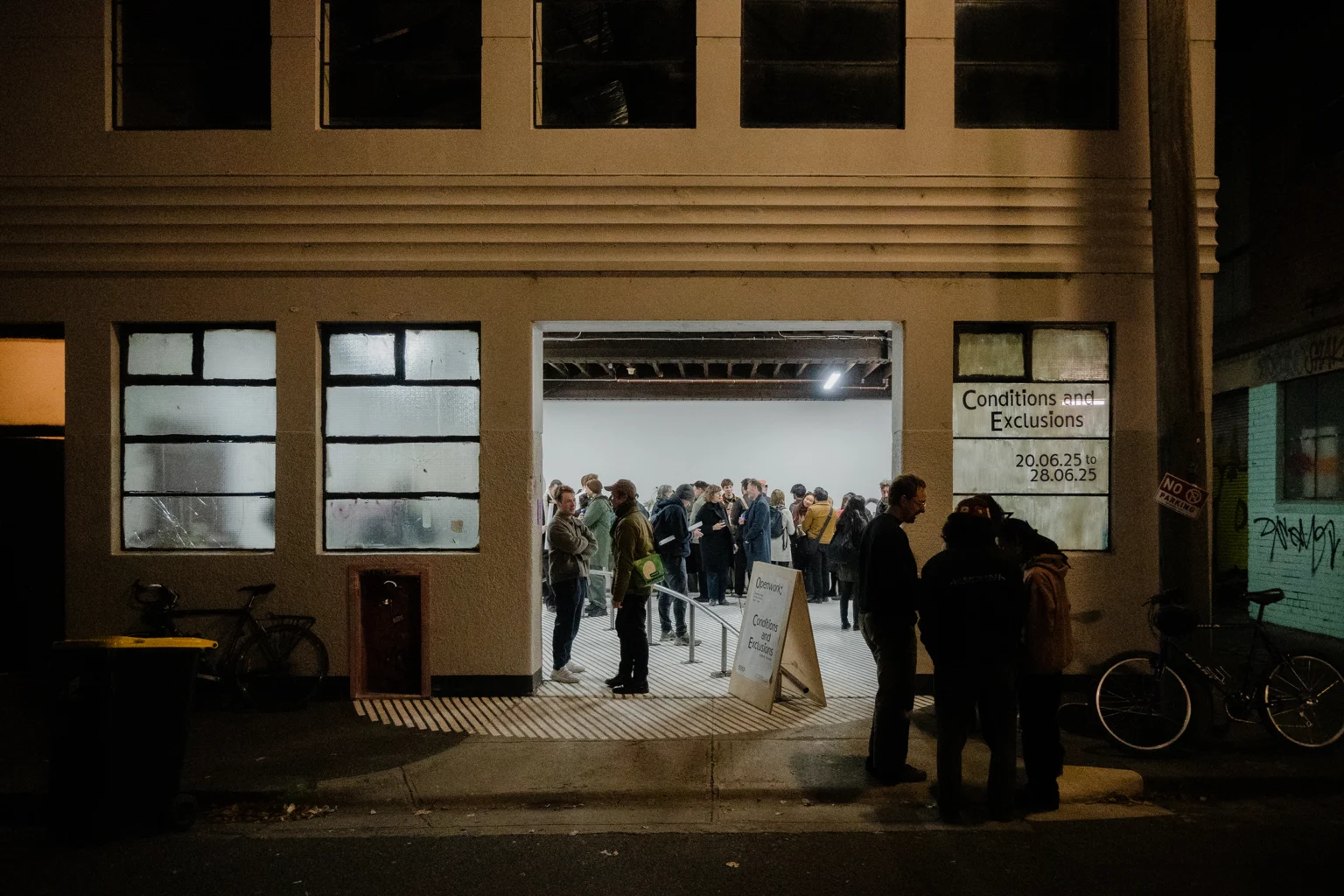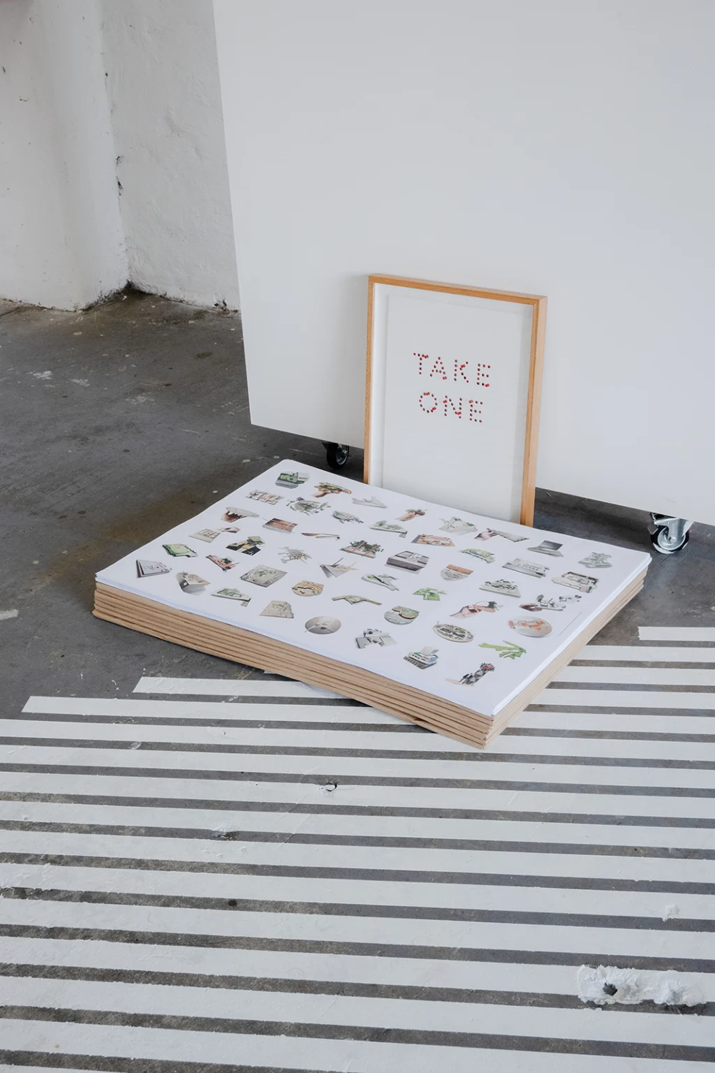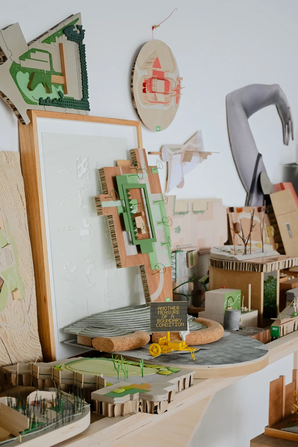 This is our show at 3553. Our practice has always made small models. They’re not the proper models you see in books and monographs. They’re done quickly and generally done once, to fix an idea in time. Our models are made to help us remember. They are a way of holding an intention. We might describe part of that intention as a ‘condition’ and/or an ‘exclusion’. A condition is about remaking the situation or site we’ve been asked to work in. An exclusion is about sneaking things into a design process that have been omitted from a brief. These models capture only essential strategies – their scale prevents reliance on form, detail, and materiality (all dead ends for urban projects). In this sense, they are mnemonic objects – physical statements that allow us to remember the essential parti of the thing, and that ward against any future dilution or normalisation of it. They have been displayed in groupings of colour. The painting on the floor of the gallery is a 1:1 drawing of our RMIT bollard (project 079) and the rail installed in the gallery is a section line through the bollard’s centre. It’s a way of permitting people skate on a thing that was originally designed to exclude them.